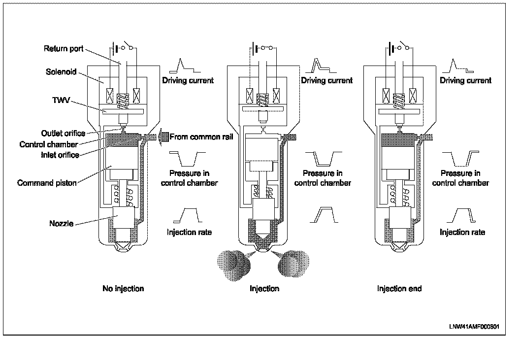 The TWV is pulled up to open the outlet orifice, and thus the fuel leaks toward the return port, when the current is supplied from the ECM to the solenoid. As a result, the nozzle is pushed up together with the command piston by the fuel pressure applied to the nozzle leading end, and then the nozzle injection holes open to inject the fuel.