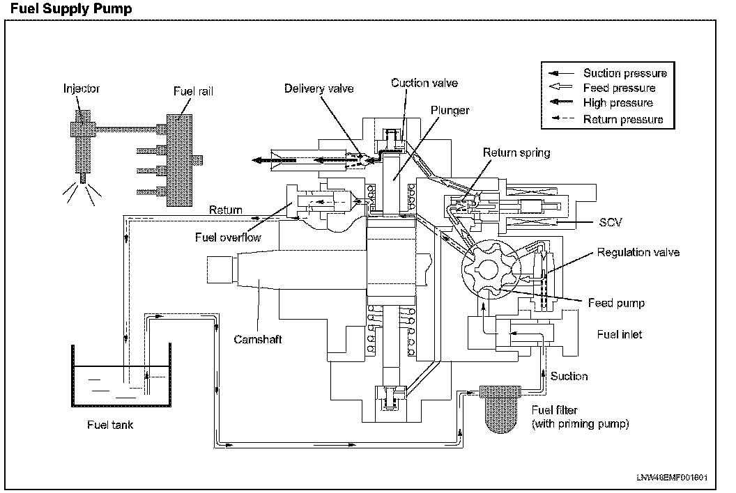 Fuel is drawn from the fuel tank via the fuel supply pump by the use of an internal feed pump (trochoid type). This feed pump pumps fuel into a 2-plunger chamber also internal to the fuel supply pump. Fuel into this chamber is regulated by the suction control valve (SCV) solely controlled by current supplied from the engine control module (ECM). No current to the solenoid results in maximum fuel flow whereas full current to the solenoid produces no fuel flow. As the engine spins, these two plungers produce high pressure in the fuel rail. Since the ECM controls the flow of fuel into this 2-plunger chamber, it therefore controls the quantity and pressure of the fuel supply to the fuel rail. This optimizes performance, improves economy and reduces NOx emissions.