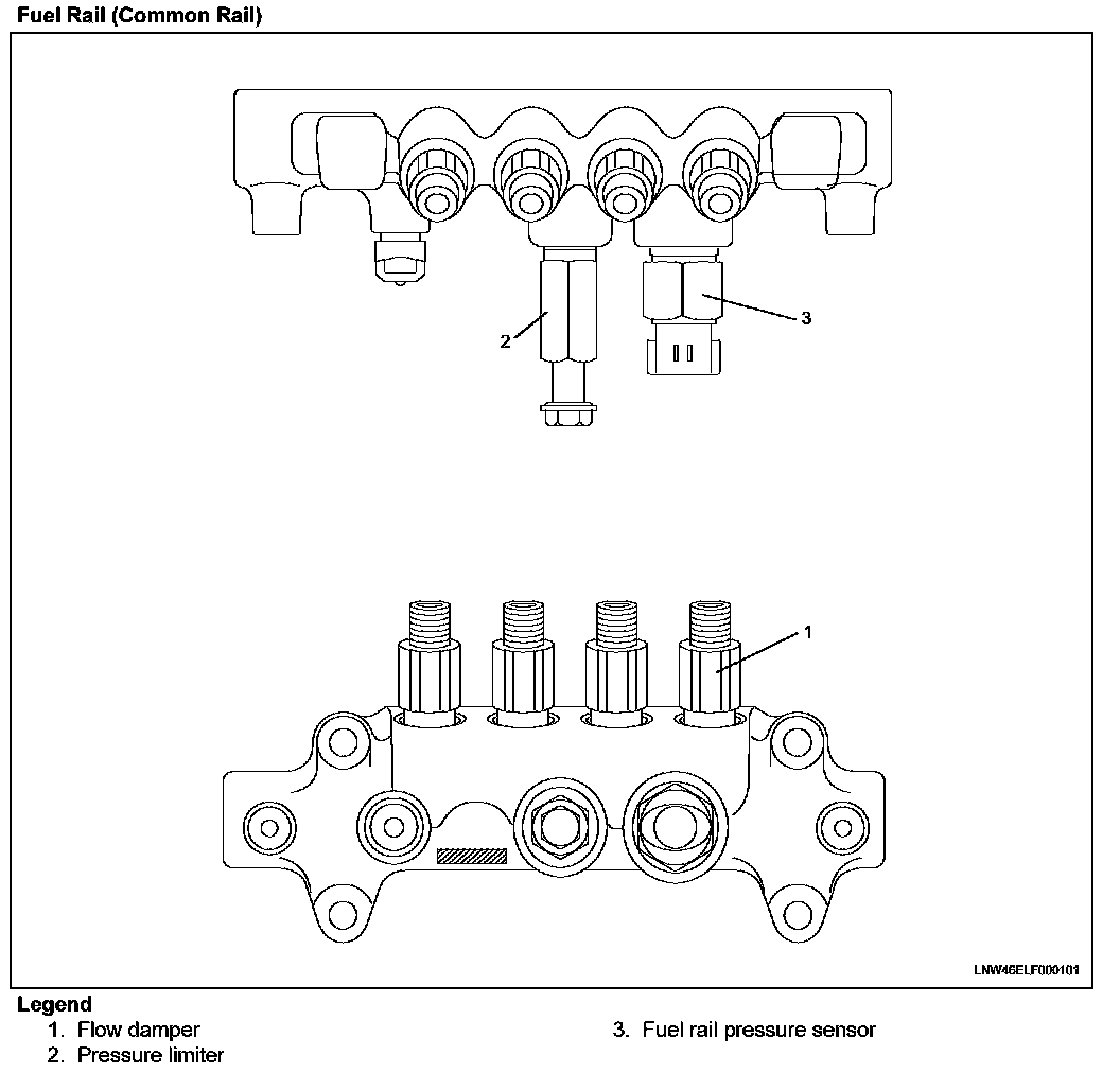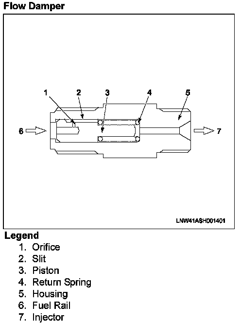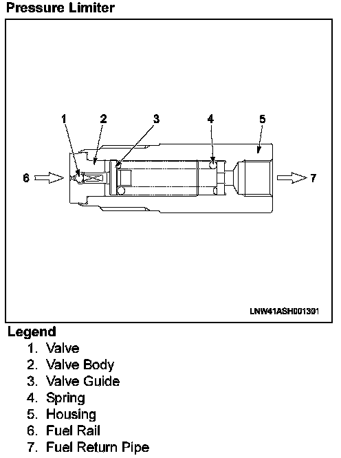The pressure limiter relieves pressure by opening the valve if abnormally high pressure is generated. The valve opens when pressure in rail reaches approximately 29000 psi (200 MPa), and closes when pressure falls to approximately 8700 psi (60 MPa). Fuel leakage through the pressure limiter re-turns to the fuel tank.
