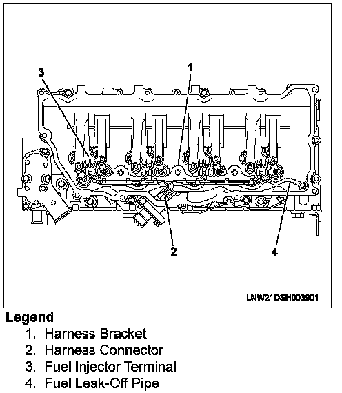 5. Alternately loosen the fuel injector terminal nuts a little at a time in sequence. Several loosening cycles should be required before the nuts are loose.
