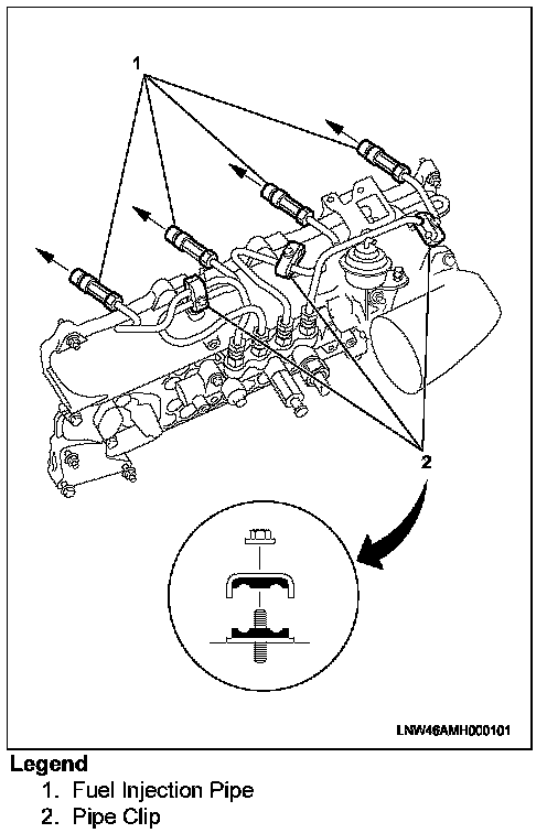 9. Remove the fuel injection pipe clips and the injection pipes.