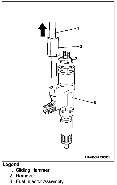 If the fuel injectors are difficult to remove, use the fuel injector remover. Install the fuel injector remover to the leak-off pipe attachment part on the fuel injector. Use a sliding hammer to force the fuel injector clamp off the fuel injector.