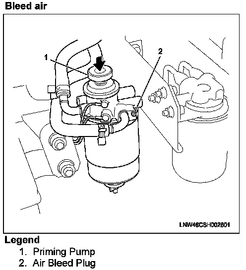 c. Tighten the plug, and operate the priming pump more than 10 times until it is filled with fuel. After waiting for approximately a minute, loosen the plug and bleed out the air in the fuel filter. (This work must be repeated a minimum of three times until no more air comes out from the plug.)