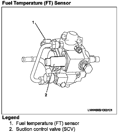 Fuel Temperature (FT) SensorThe fuel temperature (FT) sensor is installed on the fuel supply pump. It is a variable resistor. The FT sensor has a signal circuit and a low reference circuit. The FT sensor measures the fuel temperature of the fuel. The engine control module (ECM) supplies 5 volts to the FT signal circuit and a ground for the FT low reference circuit. When the FT sensor is cold, the sensor resistance is high. When the air temperature increases, the sensor resistance decreases. With high sensor resistance, the ECM detects a high voltage on the FT signal circuit. With lower sensor resistance, the ECM detects a lower voltage on the FT signal circuit.