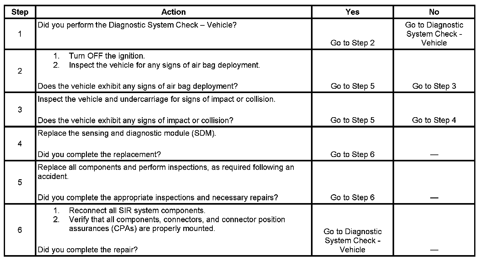 Ignition voltage must be present and the SDM must have commanded an air bag deployment with loop faults.