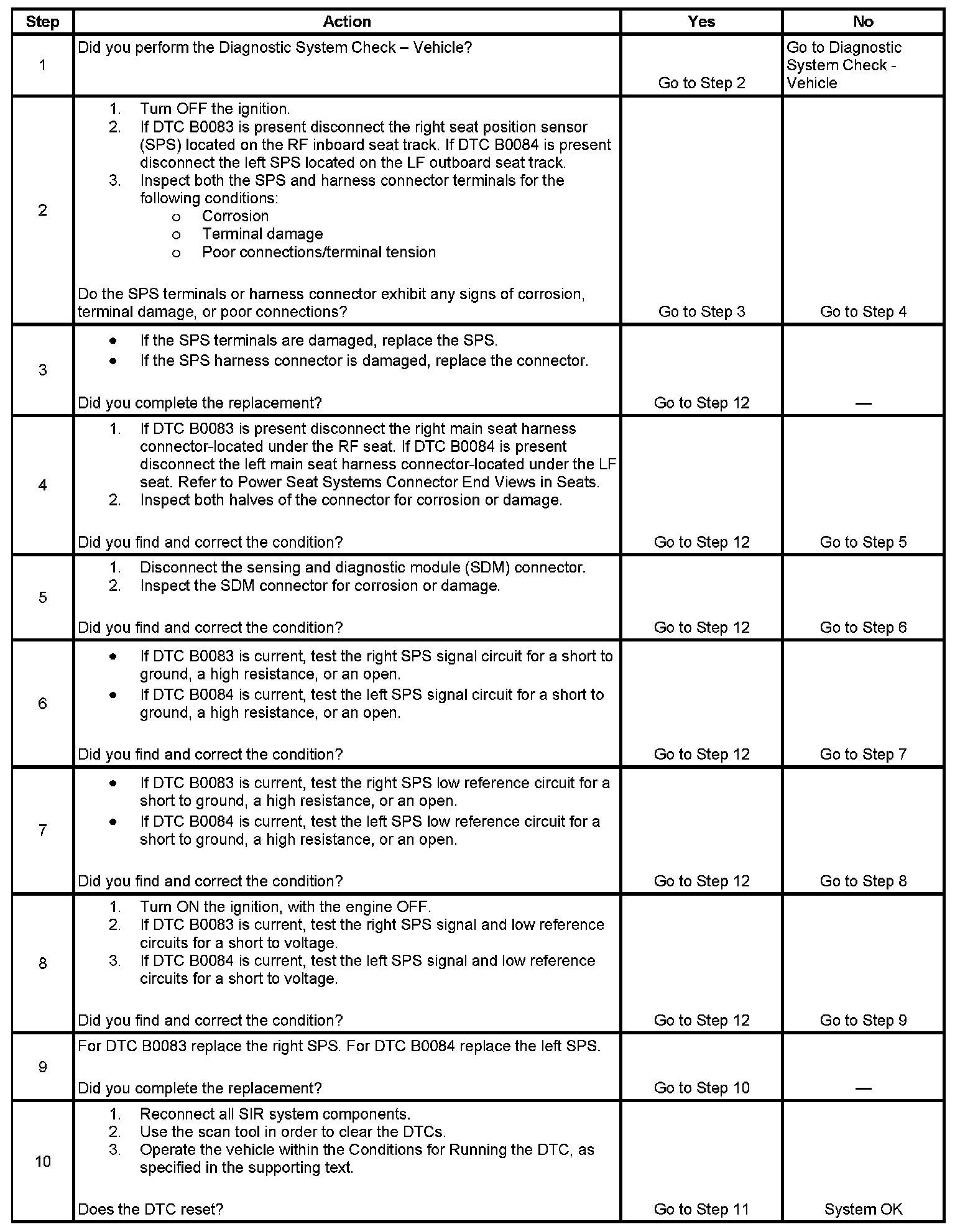 The inflatable restraint seat position sensor (SPS) is used to determine the proximity of a front driver or passenger seat position with respect to the frontal air bag. The SPS interfaces with the sensing and diagnostic module (SDM). The state of the SPS allows the SDM to disable stage 2 of the frontal air bag for a front seat that is forward of a forward/rearward point in seat track travel. The SPS is a Hall effect sensor that is mounted on the seat track of both the driver and passenger seats. The seat track includes a metal bracket that shunts the SPS magnetic circuit creating 2 states of seat position. The shunted state represents a rearward seat position. The non-shunted state represents a forward position. The SPS provides 2 current ranges, one range for the shunted state and a second range for a non-shunted state. These 2 states are inputs to the SDM. State 1 (shunted) being the rearward threshold and state 2 (non-shunted) being the forward threshold. When the SDM receives input from a SPS that state 1 threshold is reached (seat is rearward) the SDM will not disable stage 2 deployment, if required by the deployment sensors. When state 2 threshold is reached (seat is forward) the SDM will disable stage 2 deployment on the side the seat is forward. The SDM monitors the SPS circuit and if a fault is detected the SDM will set codes B0083 or B0084 and defaults to disabling stage 2 frontal deployment. This will only default on the side of the vehicle the sensor has a fault. Its important to understand that the SPS is secondary to the passenger presence system (PPS) and the manual instrument panel module (IPM) disable switch. If either one of these devices are in the disable mode the passenger air bag will not deploy regardless of the SPS status.