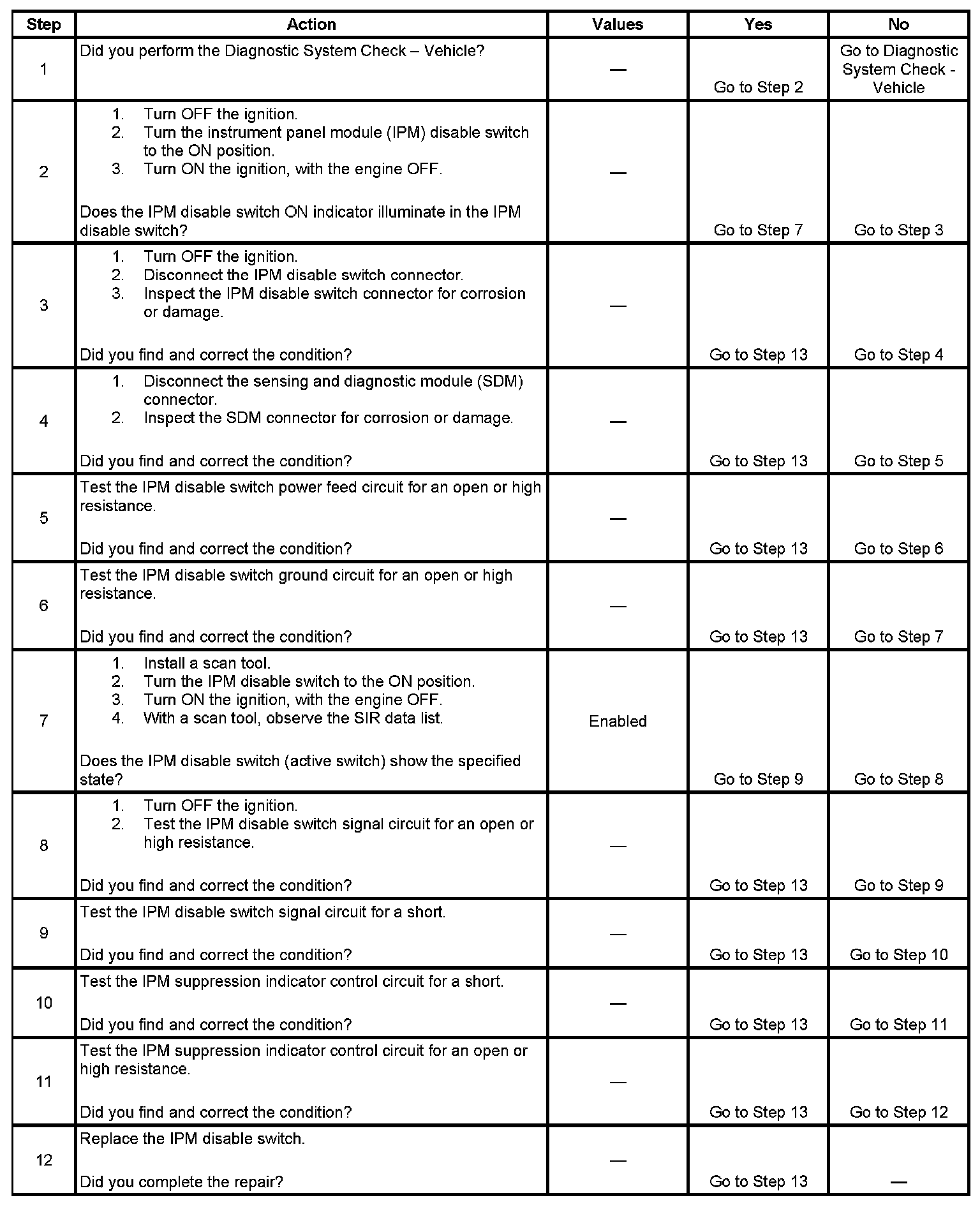 The inflatable restraint instrument panel module (IPM) disable switch circuit consists of an IPM disable switch, IPM disable switch indicator, IPM disable switch signal circuit, and IPM suppression indicator control circuit. When the ignition is turned ON, the inflatable restraint sensing and diagnostic module (SDM) performs tests to diagnose critical malfunctions within itself. The SDM monitors the voltage levels at the IPM disable switch signal and the IPM suppression indicator control circuits of the SDM to determine the position of the IPM disable switch. If a malfunction is detected, a DTC will be stored in memory.