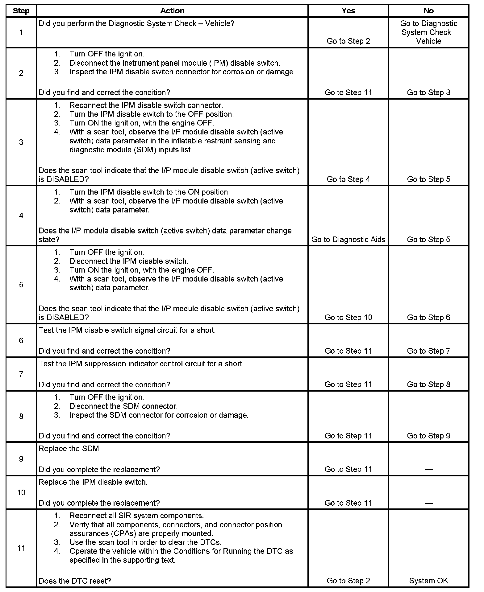 The inflatable restraint instrument panel module (IPM) disable switch circuit consists of an IPM disable switch, IPM disable switch indicator, IPM disable switch signal circuit, and IPM suppression indicator control circuit. When the ignition is turned ON, the inflatable restraint sensing and diagnostic module (SDM) performs tests to diagnose critical malfunctions within itself. The SDM monitors the voltage levels at the IPM disable switch signal and the IPM suppression indicator control circuits of the SDM to determine the position of the IPM disable switch. If a malfunction is detected, a DTC will be stored in memory.