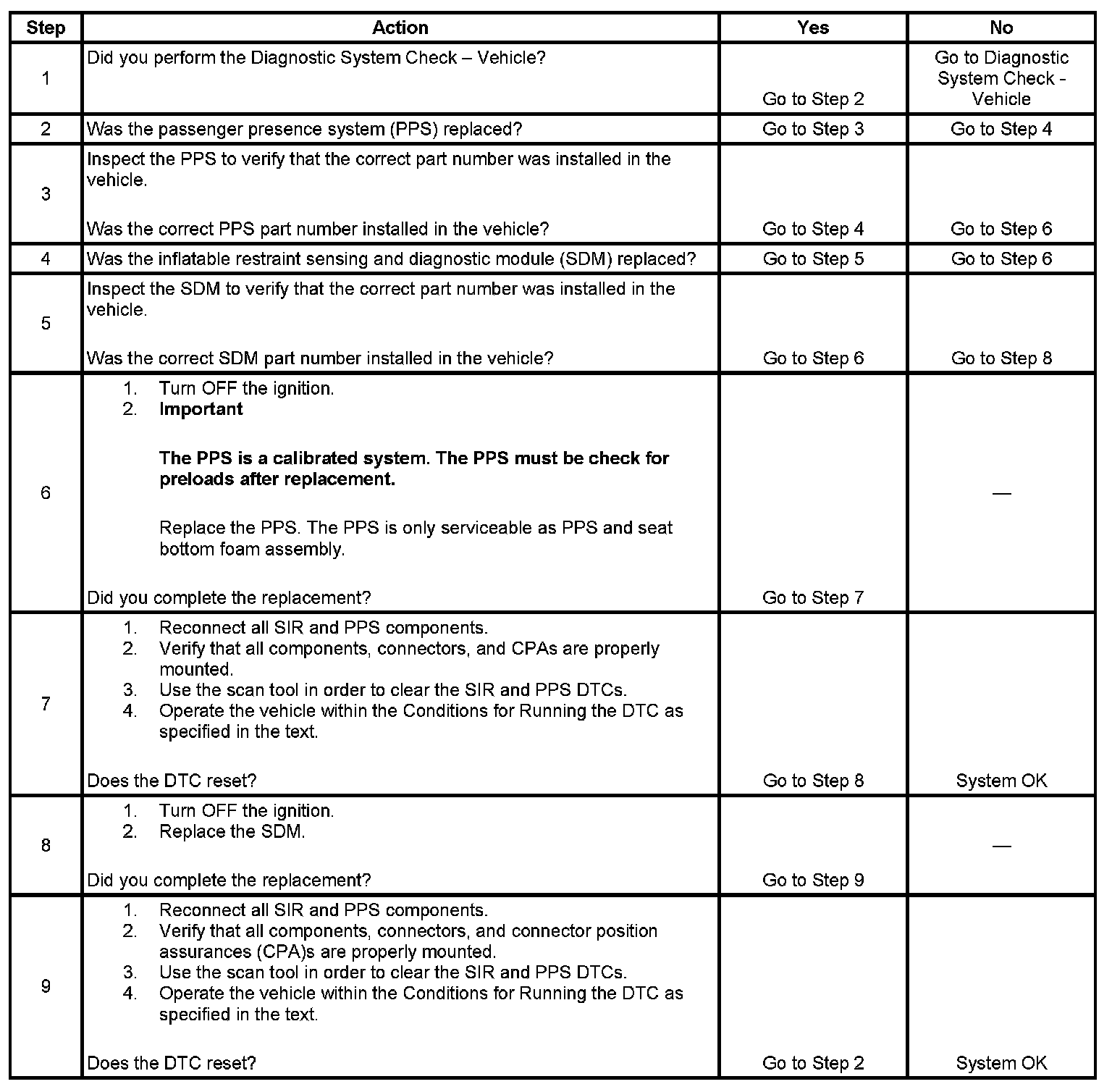 When the ignition is turned ON, the inflatable restraint sensing and diagnostic module (SDM) performs tests to diagnose critical malfunctions within itself. When the SDM has completed the power-up mode, the SDM will establish communication with the passenger presence system (PPS). The PPS will respond by commanding both of the PASSENGER AIR BAG ON/OFF indicators ON for 5 seconds. The SDM will then transmit a request message to the PPS to receive the PPS verification ID. The PPS will transmit the verification ID to the SDM, and the SDM will compare the ID received to data stored in memory. If the data stored in memory does not match the information transmitted by the PPS, the SDM will set DTC B0098 and command the AIR BAG indicator ON.