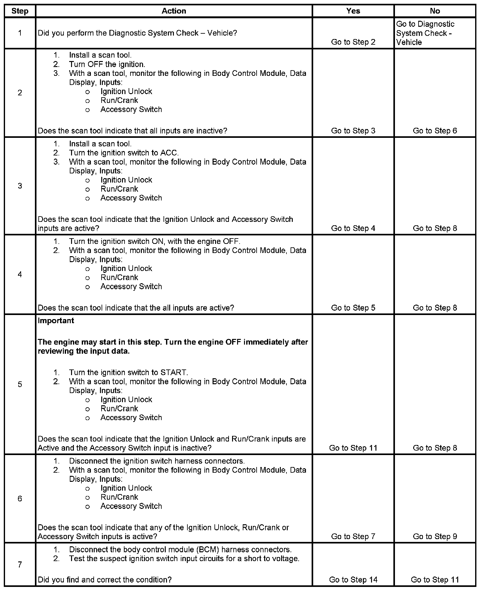The body control module (BCM) is the power mode master responsible for sending ignition switch position information on the class 2 serial data link. The BCM monitors 3 discrete wires from the ignition switch contacts and the engine run flag (ERF) in order to determine the present power mode. The BCM communicates this power mode information to all class 2 modules on the class 2 serial data link. The table represents correct BCM power mode data.