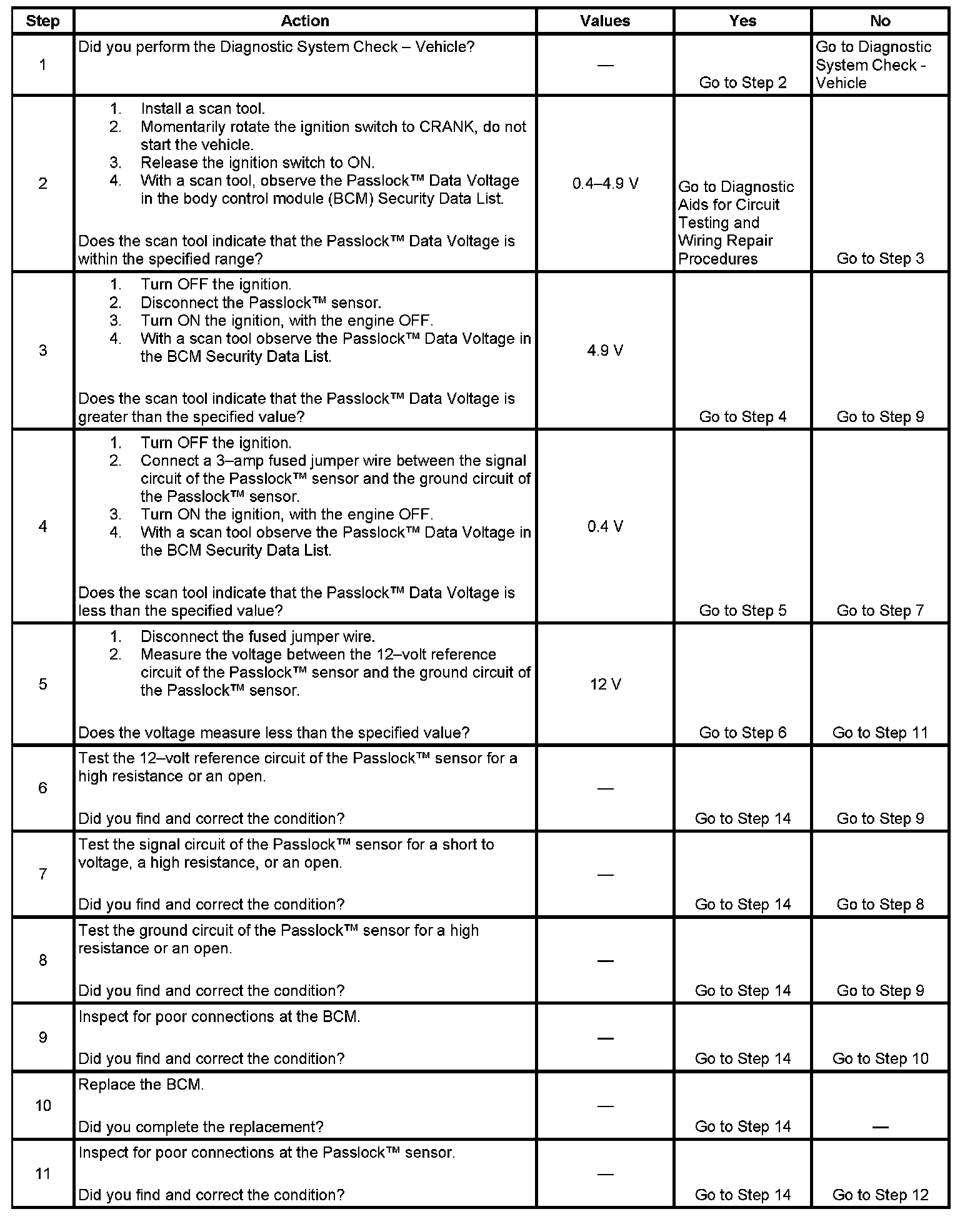 - Inspect the Passlock(TM) sensor harness for an intermittent or a short to battery.
