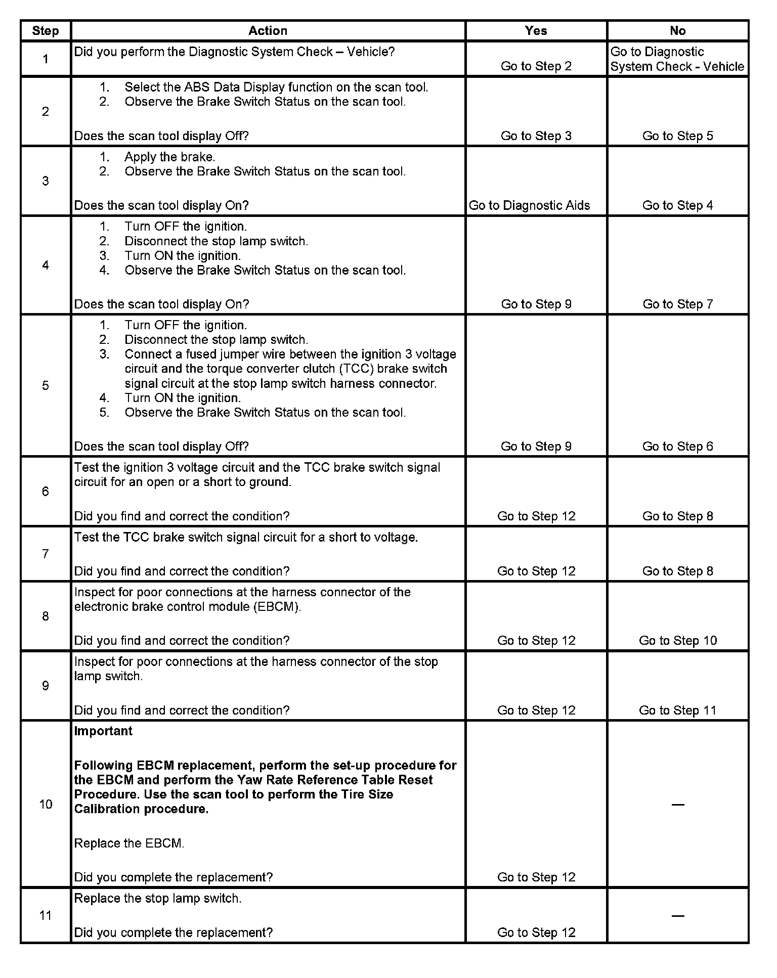 The brake switch informs the electronic brake control module (EBCM) when the brake is depressed. The brake switch is normally closed, supplying 12 volts to the EBCM when the brake is released. When the brake pedal is pressed, voltage on the torque converter clutch (TCC) brake switch signal circuit is 0 volts.