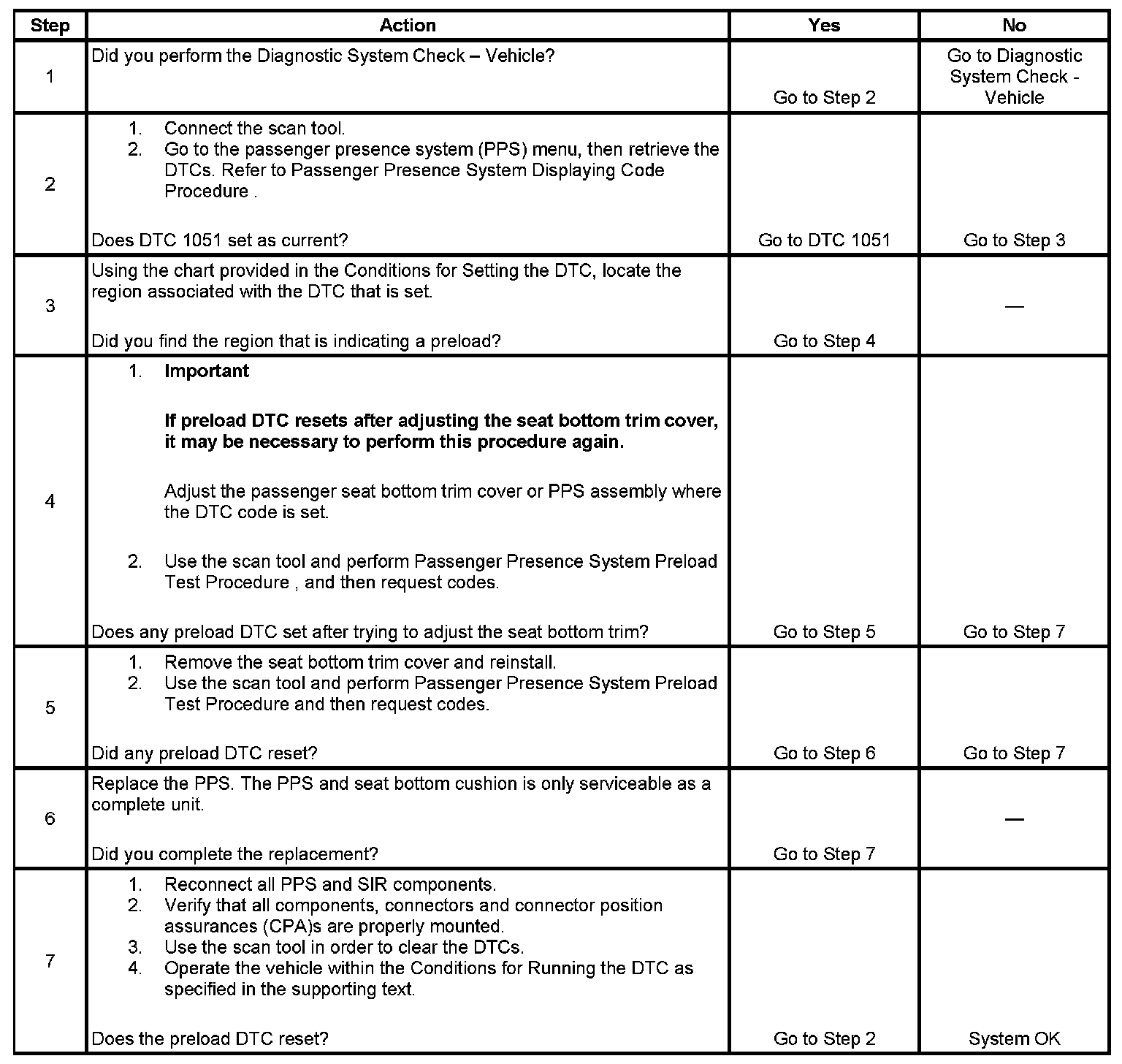 The passenger presence system (PPS) is divided up into 6 regions. When there is an unwanted force being applied to one or more PPS regions, the PPS will set a diagnostic trouble code (DTC). If the PPS detects any preload DTC within the PPS, then the PPS will communicate to the SDM through a non class 2 communications circuit that a PPS fault is present. The SDM will then set DTC B0092 indicating a problem within the PPS.