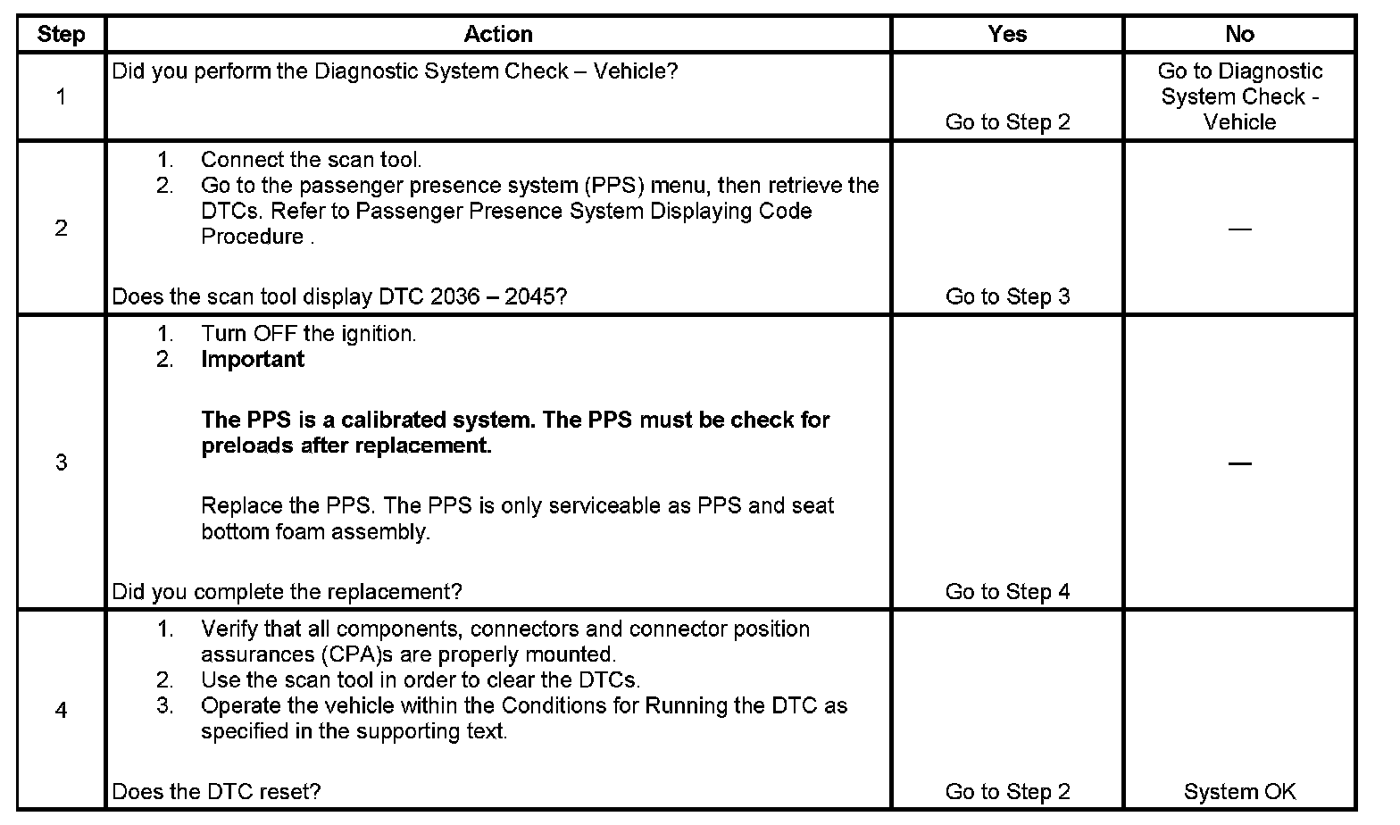 The inflatable restraint passenger presence system (PPS) is used to monitor the pressure profile of any occupant that is sitting in the front outboard passenger seat and communicate the profile classification to the sensing and diagnostic module (SDM). The SDM will either enable or suppress the deployment of the instrument panel (I/P) module based on the profile classification of the occupant. If the PPS detects this DTC within the PPS, then the PPS will communicate to the SDM through a non class 2 communications circuit that a PPS fault is present. The SDM will then set DTC B0092 indicating a problem within the PPS.