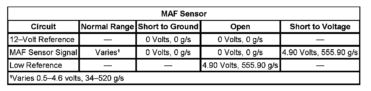 - If the MAF Sensor parameter is less than 4.7 volts and 500 g/s, test the MAF sensor signal circuit for a high resistance or a faulty ECM.