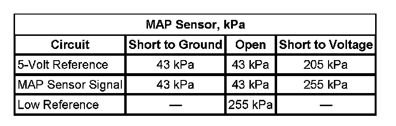 - If the MAP Sensor parameter is not more than 250 kPa or 4.8 volts, test the signal circuit for an open, a short to ground or a faulty ECM.