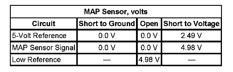 1. With the ignition ON, the engine OFF, and the MAP sensor disconnected, use a DMM and measure for a voltage of less than 0.4 volt between the MAP sensor signal circuit and a good ground.