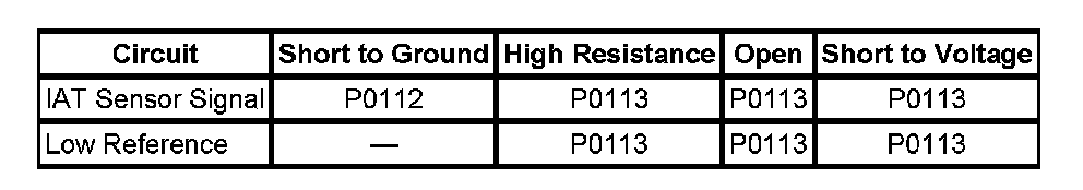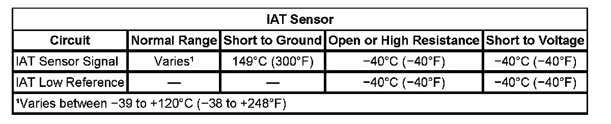 The IAT Sensor parameter is less than -39°C (-38°F) for more than one second. This is equal to more than 4.8 volts on the IAT signal circuit as measured by the ECM.