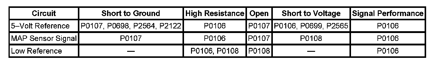 The manifold absolute pressure (MAP) sensor measures the pressure inside the intake manifold. Pressure in the intake manifold is affected by turbocharger output, engine speed, accelerator pedal input, air temperature, and barometric pressure (BARO). A diaphragm within the MAP pressure sensor is displaced by the pressure changes that occur from the varying load and operating conditions of the engine. The sensor translates this action into electrical resistance. The MAP pressure sensor wiring includes 3 circuits. The engine control module (ECM) supplies a regulated 5 volts to the sensor on a 5-Volt reference circuit. The ECM supplies a ground on a low reference circuit. The MAP pressure sensor provides a signal voltage to the ECM, relative to pressure, on the MAP pressure sensor signal circuit. The ECM converts the signal voltage input to a pressure value. Under normal operation, the lowest pressure that can exist in the intake manifold is equal to the BARO. This occurs when the vehicle is operated at idle or when the ignition is ON while the engine is OFF. The highest manifold pressures occur when the turbocharger output is high. Manifold pressure can range from 58 kPa (8 psi) when pressures are low to more than 240 kPa (34 psi) when pressures are high, depending on the BARO. The MAP pressure sensor has a range of 33-255 kPa (4-36 psi). The ECM diagnoses the MAP sensor by a calculated predicted value at a predetermined engine load and speed. The ECM then compares the predicted value to the sensor actual input.