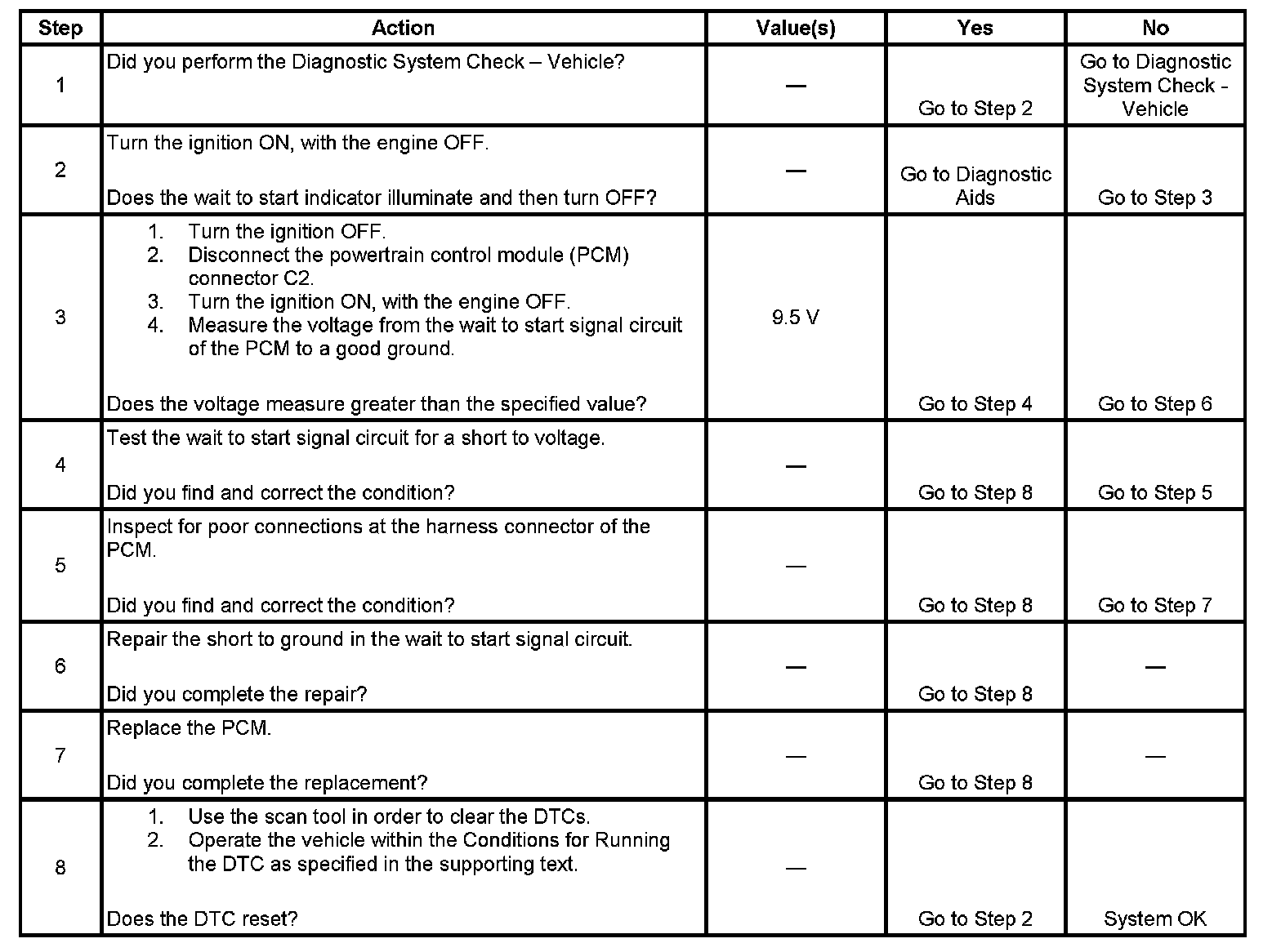 Ignition voltage is supplied directly to the wait to start indicator. The powertrain control module (PCM) controls the lamp by grounding the control circuit via an internal switch called a driver. The primary function of the driver is to supply the ground for the component being controlled. Each driver has a fault line which is monitored by the PCM. When the PCM is commanding a component ON, the voltage of the control circuit should be low, near 0 volts. When the PCM is commanding the control circuit to a component OFF, the voltage potential of the circuit should be high, near battery voltage. If the fault detection circuit senses a voltage other than what is expected, the fault line status will change causing the DTC to set.