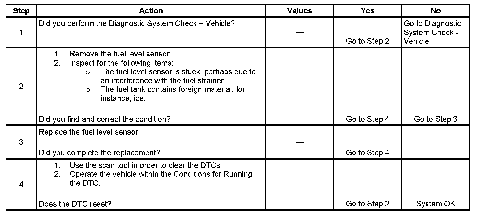 This diagnostic tests for a stuck fuel level sensor signal. The PCM sets this DTC if the fuel level sensor signal appears to be stuck based on a lack of signal variation expected during normal operation.