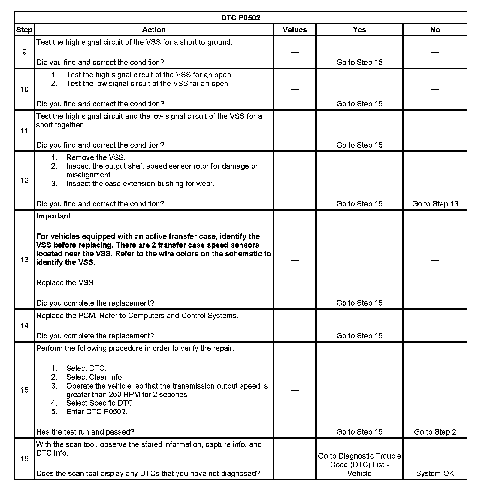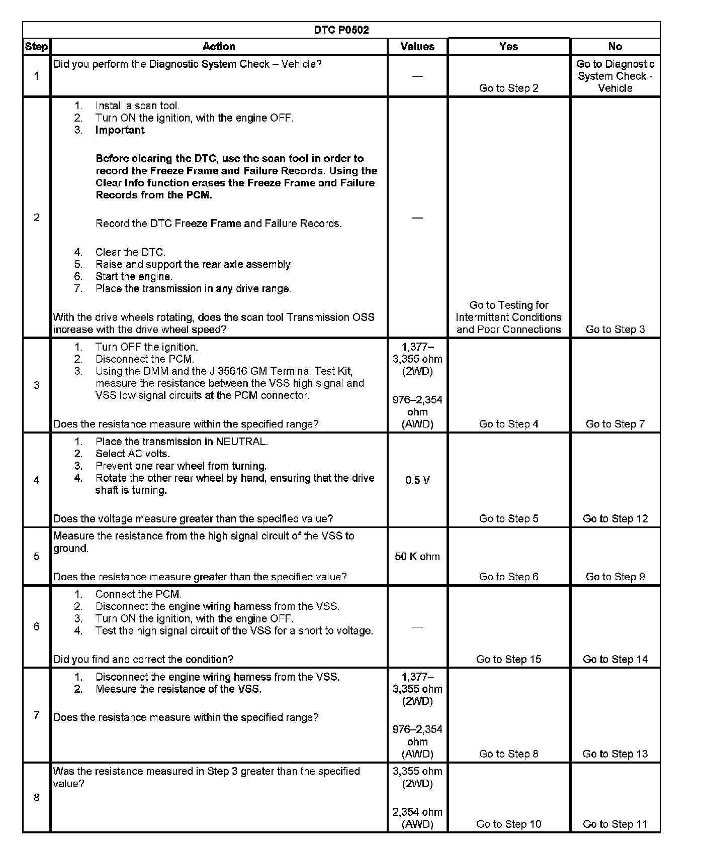 When the PCM detects a low vehicle speed when there is a high engine speed in a drive gear range, then DTC P0502 sets. DTC P0502 is a type B DTC.