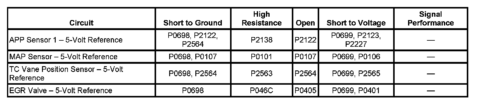 These 5-Volt reference circuits are independent of each other outside the engine control module (ECM), but are bussed together inside the ECM. Therefore, a circuit condition on one sensor 5-Volt reference circuit may affect the other sensor 5-Volt reference circuits. The ECM monitors the voltage on the 5-Volt reference circuit.