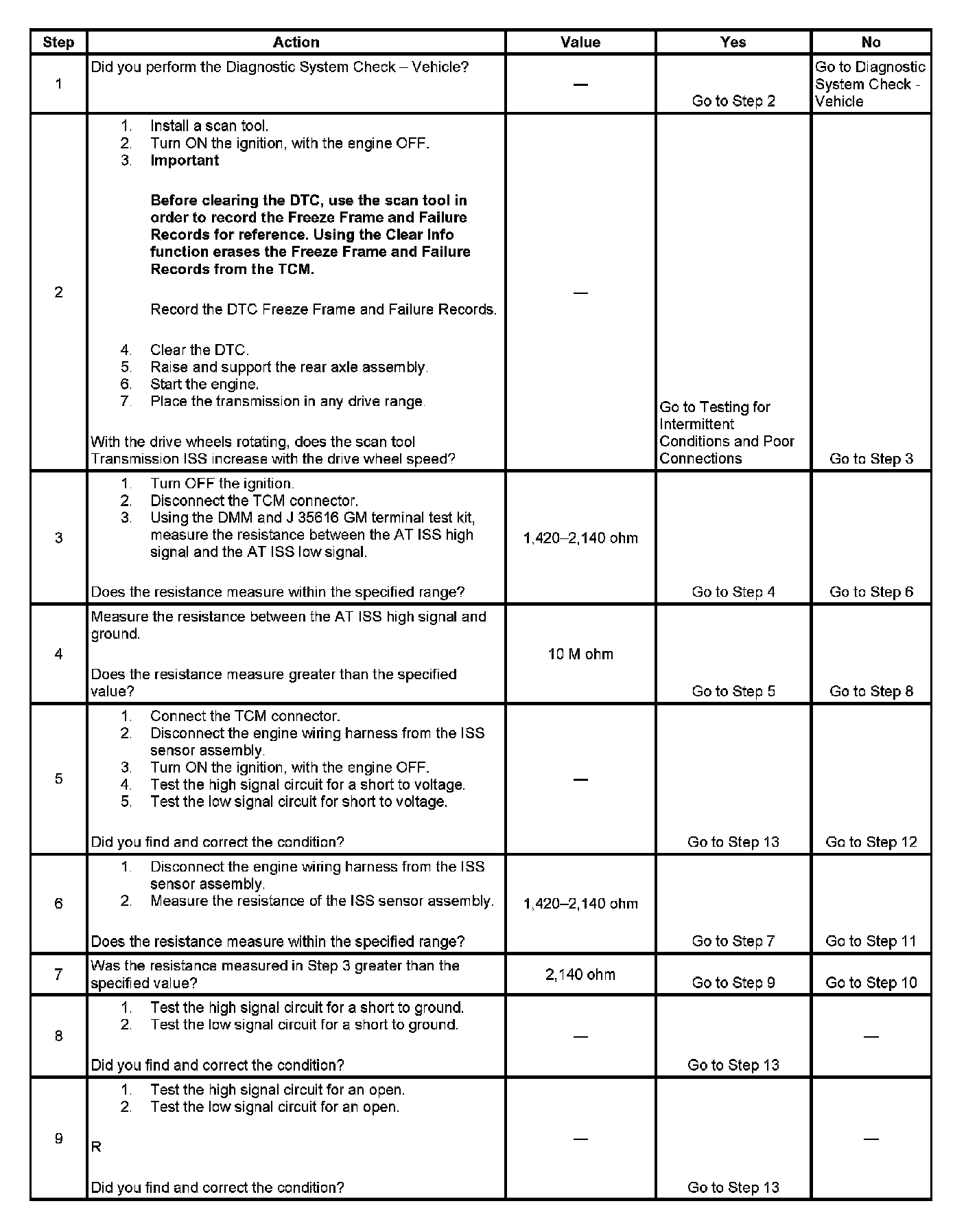 The automatic transmission input shaft speed (AT ISS) sensor provides transmission input speed to the transmission control module (TCM). The AT ISS sensor is a permanent magnet (PM) generator. The sensor mounts into the transmission case and maintains a slight air gap between the sensor and the forward clutch housing. The PM generator produces an AC voltage as the forward clutch housing rotor teeth pass through the magnetic field of the sensor. The AC voltage level increases as the turbine shaft speed increases. The TCM converts the AC voltage into a digital signal. The TCM determines actual turbine speed using the digital signal. The TCM uses the input speed to calculate torque converter slip speed, and gear ratios.
