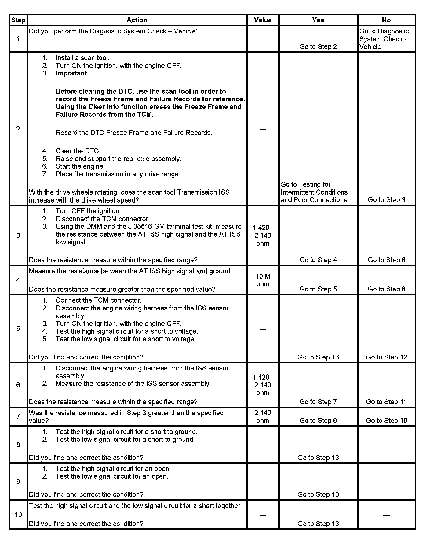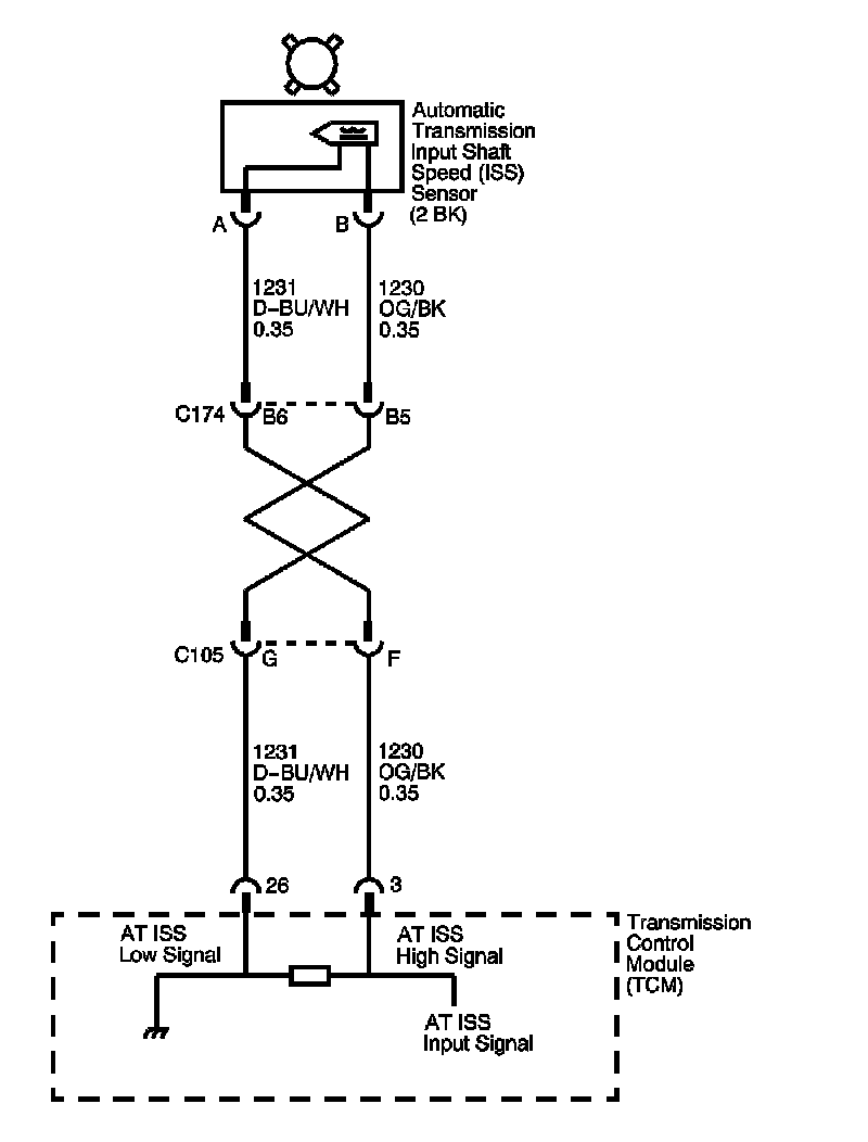 The automatic transmission input shaft speed (AT ISS) sensor provides transmission input speed to the transmission control module (TCM). The AT ISS sensor is a permanent magnet (PM) generator. The sensor mounts into the transmission case and maintains a slight air gap between the sensor and the forward clutch housing. The PM generator produces an AC voltage as the forward clutch housing rotor teeth pass through the sensor's magnetic field. The AC voltage level increases as the turbine shaft speed increases. The TCM converts the AC voltage into a digital signal. The TCM determines actual turbine speed using the digital signal. The TCM uses the input speed to calculate torque converter slip speed, and gear ratios.