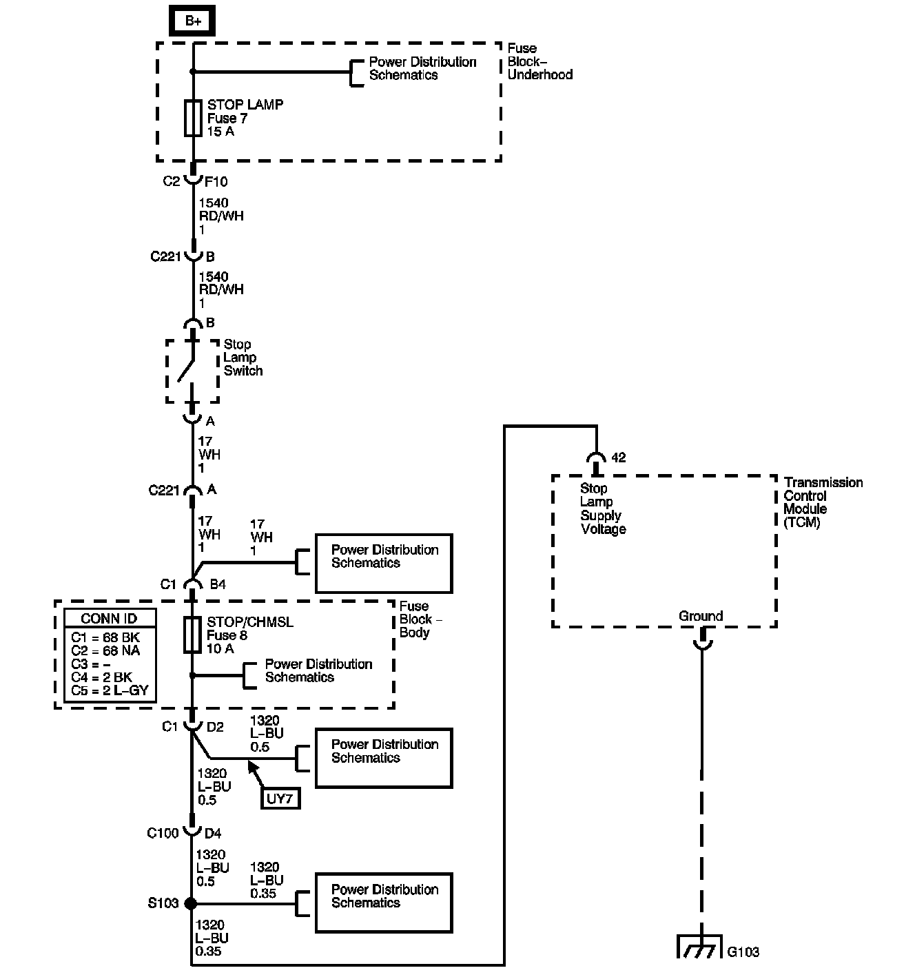 The stop lamp switch indicates the brake pedal status to the transmission control module (TCM). The brake switch is a normally-closed switch that supplies battery voltage on the stop lamp supply voltage circuit to the TCM. Applying the brake opens the stop lamp switch, interrupting voltage to the TCM. When the brake is released, the TCM receives a constant voltage signal input. If the TCM receives a 0 voltage signal input at the stop lamp supply voltage circuit, and the torque converter clutch (TCC) is engaged, the TCM de-energizes the TCC solenoid valve. The TCM disregards the brake switch input for TCC scheduling if there is a brake switch circuit fault.