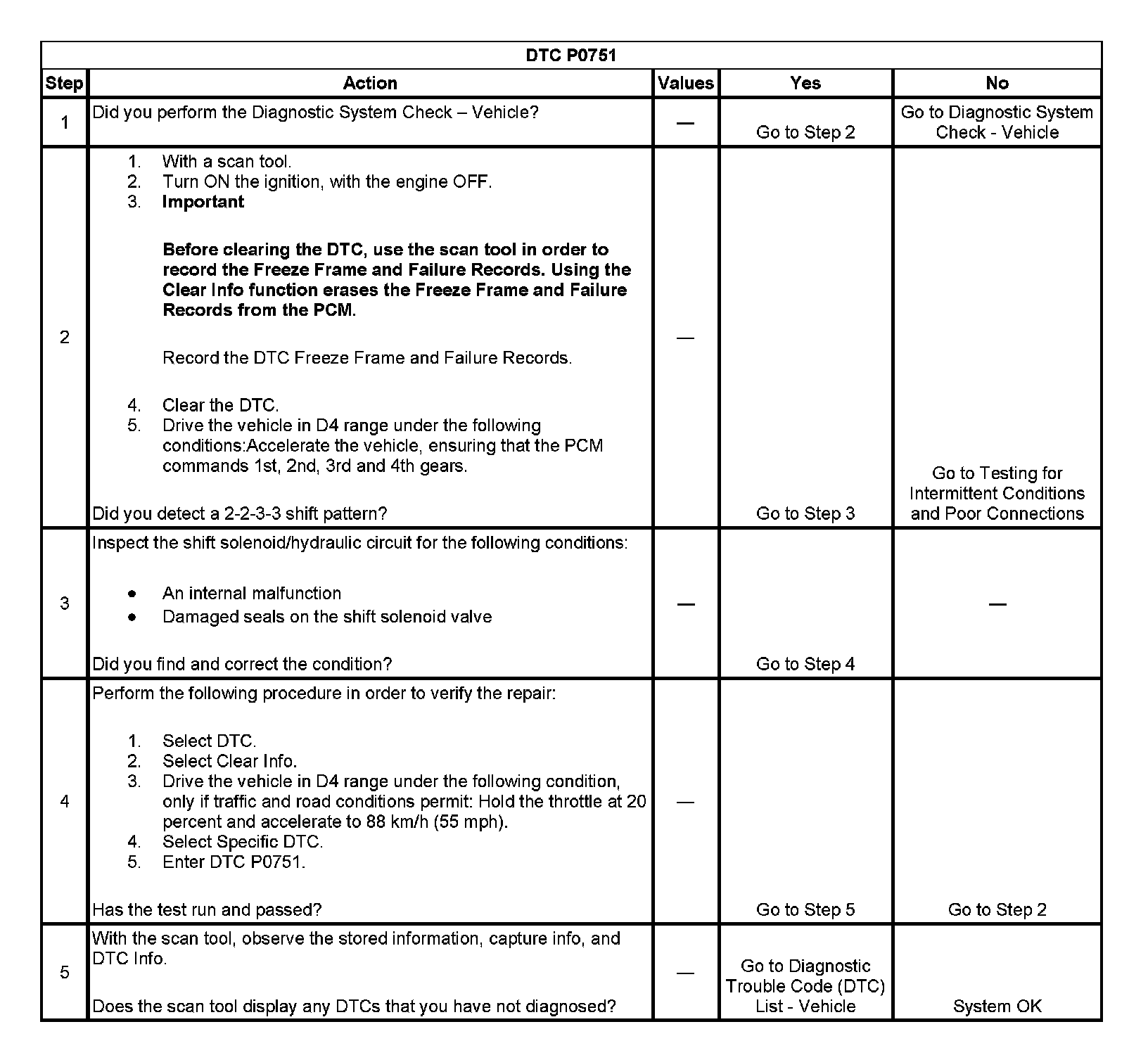 When the powertrain control module (PCM) detects a 2-2-3-3 shift pattern, then DTC P0751 sets. DTC P0751 is a type B DTC.