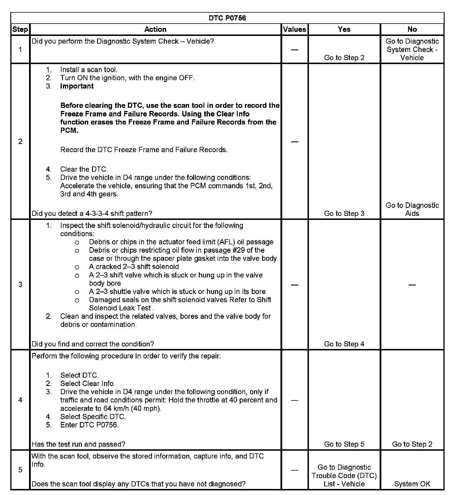 The 2-3 shift solenoid (SS) valve controls the fluid flow acting on the 2-3 shift valves. The 2-3 SS valve is a normally-open exhaust valve that is used with the 1-2 SS valve, in order to allow 4 different shifting combinations. When the powertrain control module (PCM) detects a 4-3-3-4 shift pattern, then DTC P0756 sets. DTC P0756 is a type A DTC.