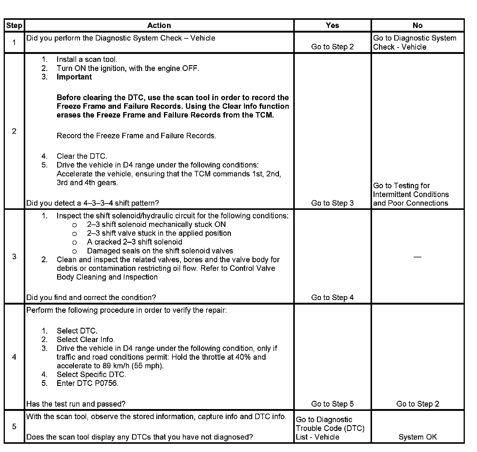 When the transmission control module (TCM) detects a 4-3-3-4 gear ratio, then DTC P0756 sets. DTC P0756 is a type C DTC. For California emissions vehicles, DTC P0756 is a type A DTC.