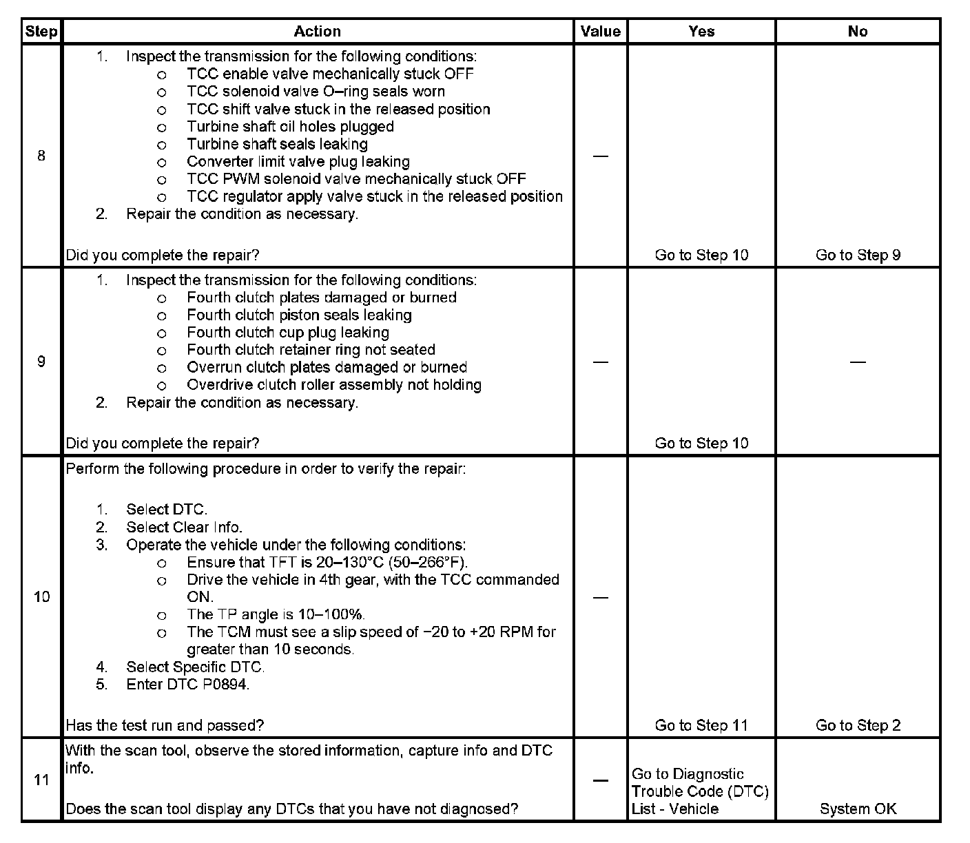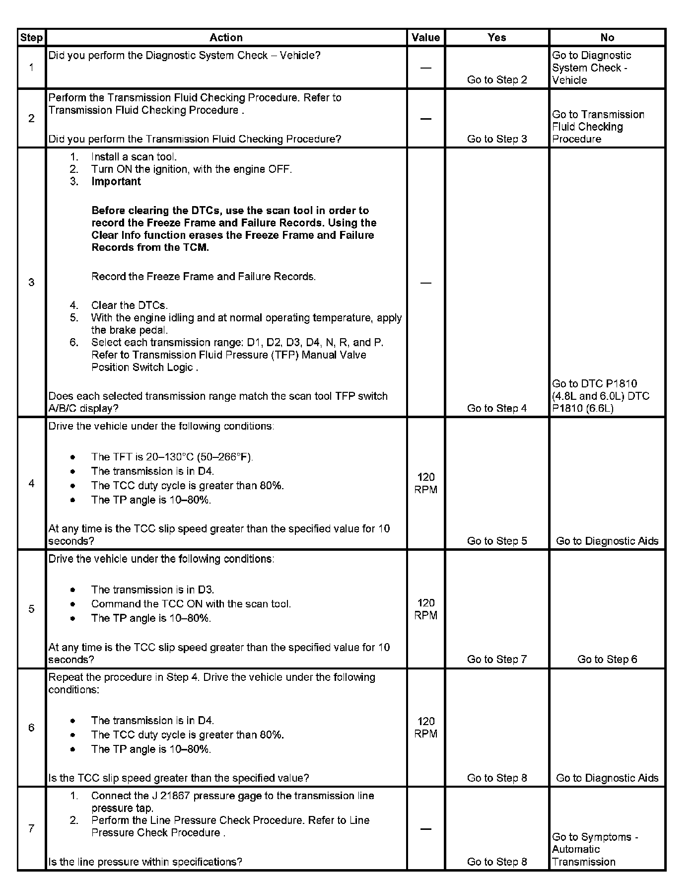 5. This step tests for excessive TCC slip speed while in a commanded TCC lock-up state and in third gear.