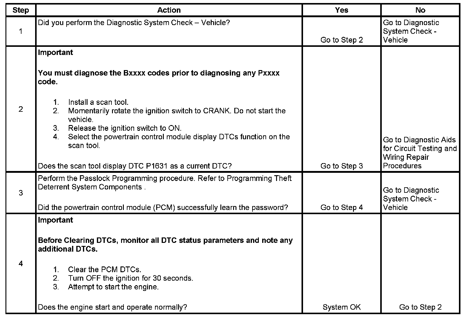 When the Passlock portion of the VTD system has sensed the proper operation of the ignition switch and lock, or determined that the switch and lock have not been tampered with, the BCM transmits a password to the PCM. Fuel delivery is enabled if this password matches the password stored in the modules memory. If a component in the theft deterrent system has been replaced, the modules need to relearn the password of the new components. If the relearn procedure was not performed, this DTC will set.