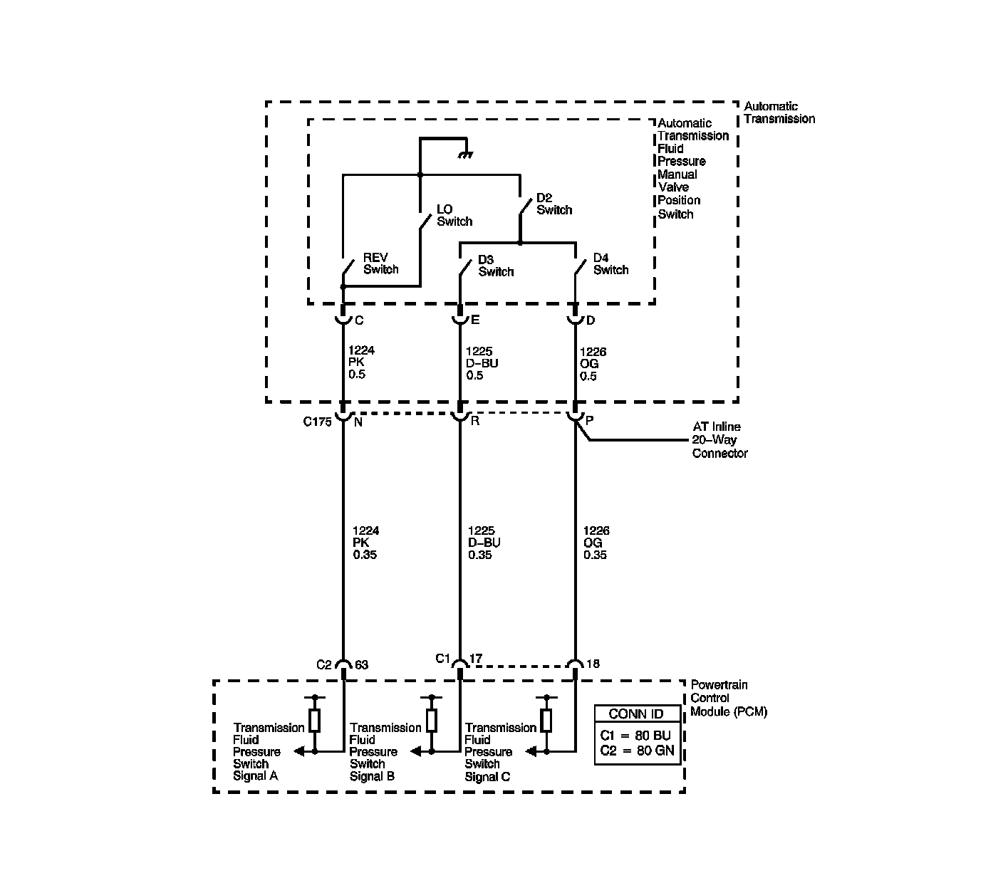 The TFP manual valve position switch cannot distinguish between PARK and NEUTRAL because the monitored valve body pressures are identical. With the engine OFF and the ignition switch in the ON position, the TFP manual valve position switch indicates PARK/NEUTRAL. Disconnecting the AT inline 20-way connector removes the ground potential for the three range signals to the PCM. In this case, with the engine OFF, and the ignition switch in the ON position, D2 will be indicated.