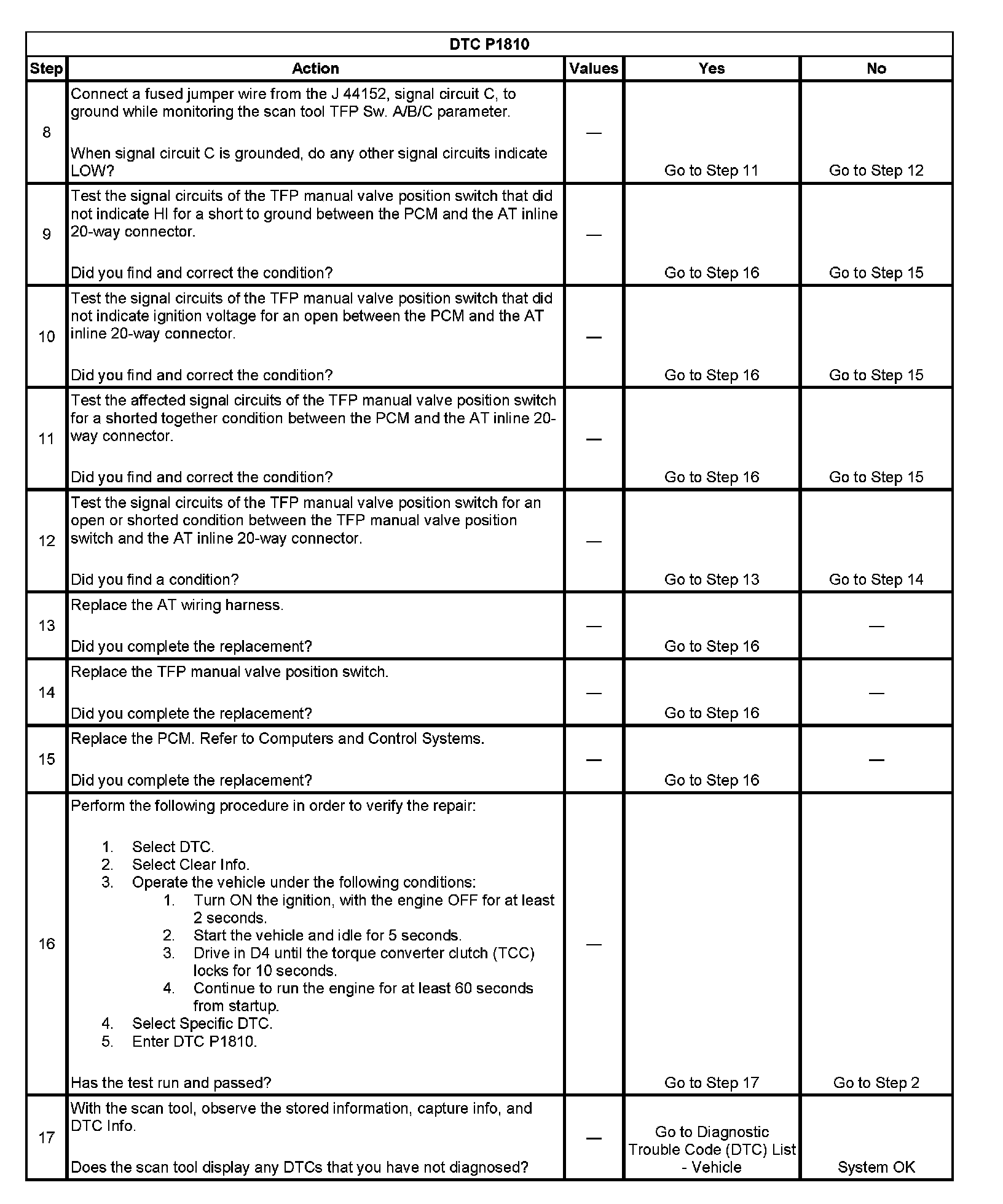 When the PCM detects an invalid state of the TFP manual valve position switch circuit by deciphering the TFP manual valve position switch inputs, then DTC P1810 sets. DTC P1810 is a type B DTC.