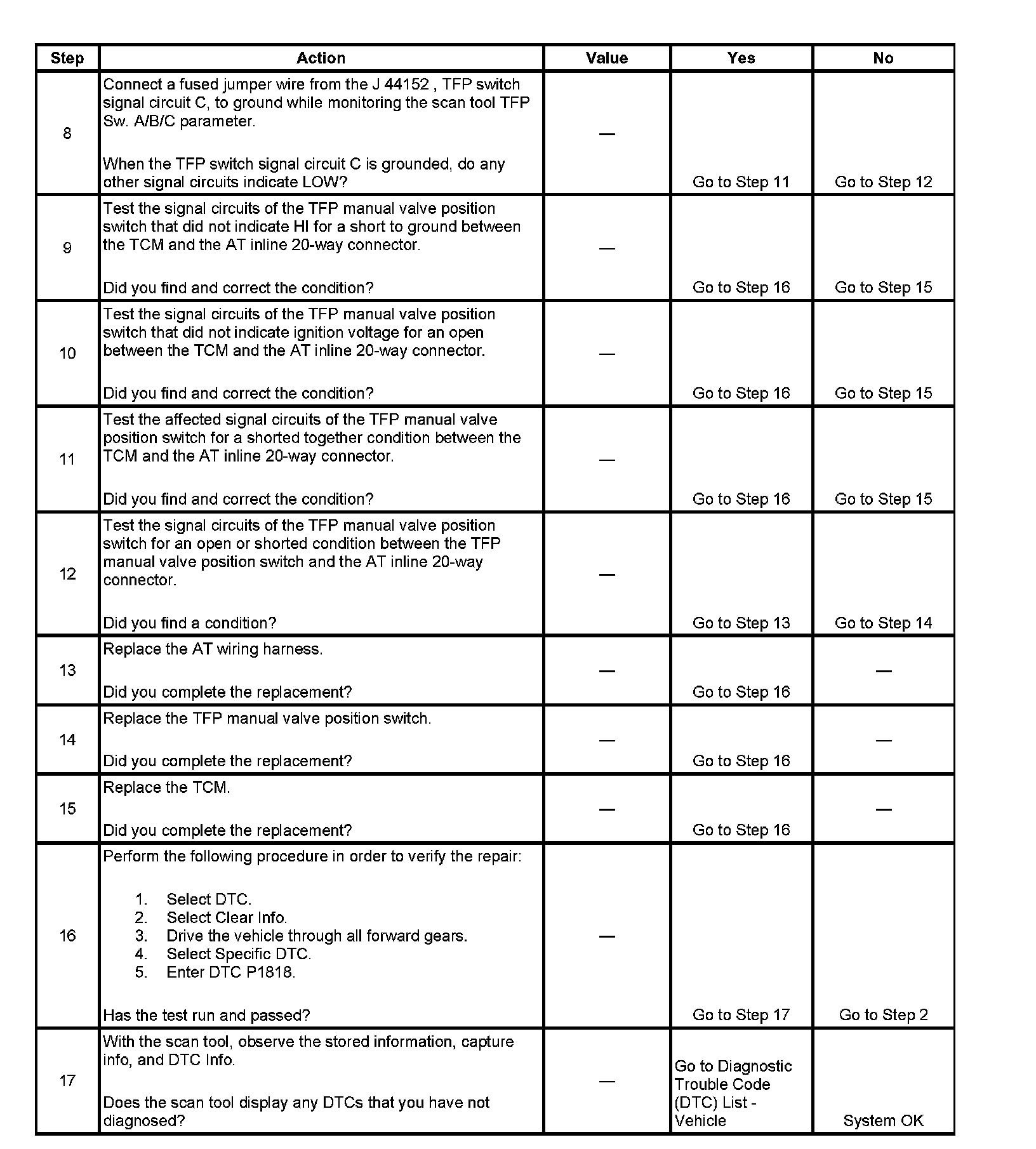 When the TCM detects an invalid state of the TFP manual valve position switch circuit by deciphering the TFP manual valve position switch inputs, then DTC P1818 sets. DTC P1818 is a type B DTC.