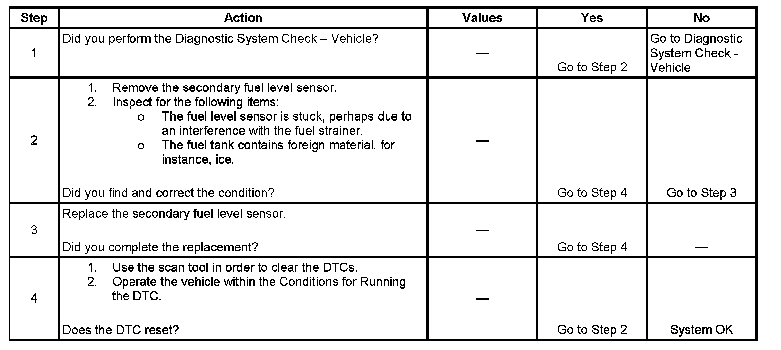 This diagnostic tests for a stuck secondary fuel level sensor signal. The PCM sets this DTC if the secondary fuel level sensor signal appears to be stuck based on a lack of signal variation expected during normal operation.