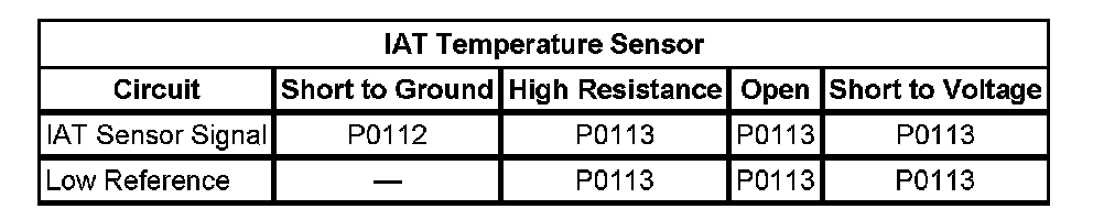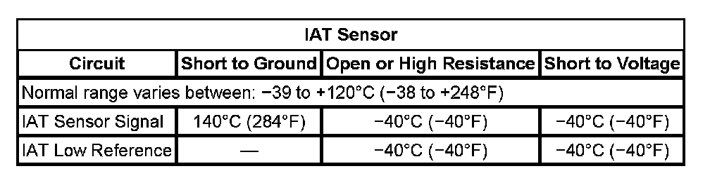 3. An IAT sensor that is skewed lower at various ambient temperatures, due to more resistance than is normal, can widen the spread between the two sensors and cause this DTC to set. Measure and record the resistance of the IAT and IAT 2 sensors at various ambient temperatures, and then compare those measurements to the Temperature vs. Resistance Table.