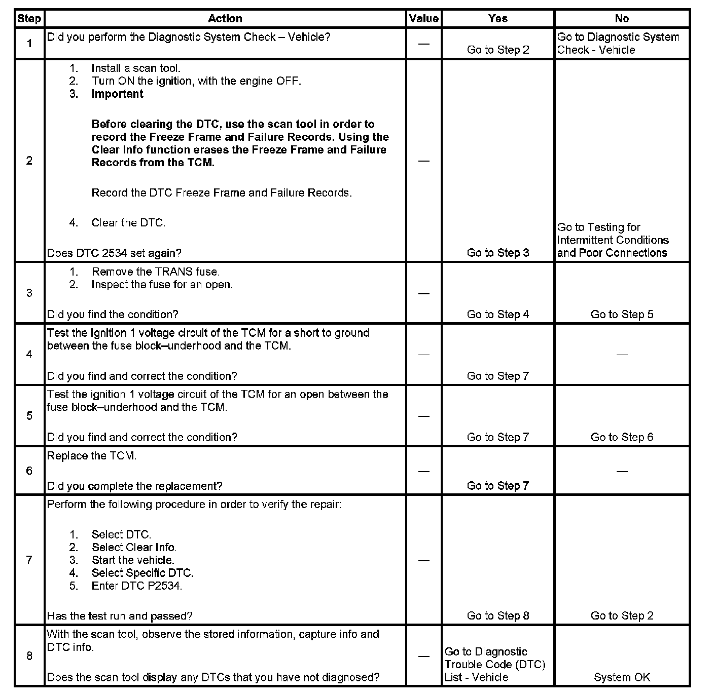 If the TCM detects low voltage on the Ignition 1 voltage circuit, DTC P2534 sets. DTC 2534 is a type A DTC.