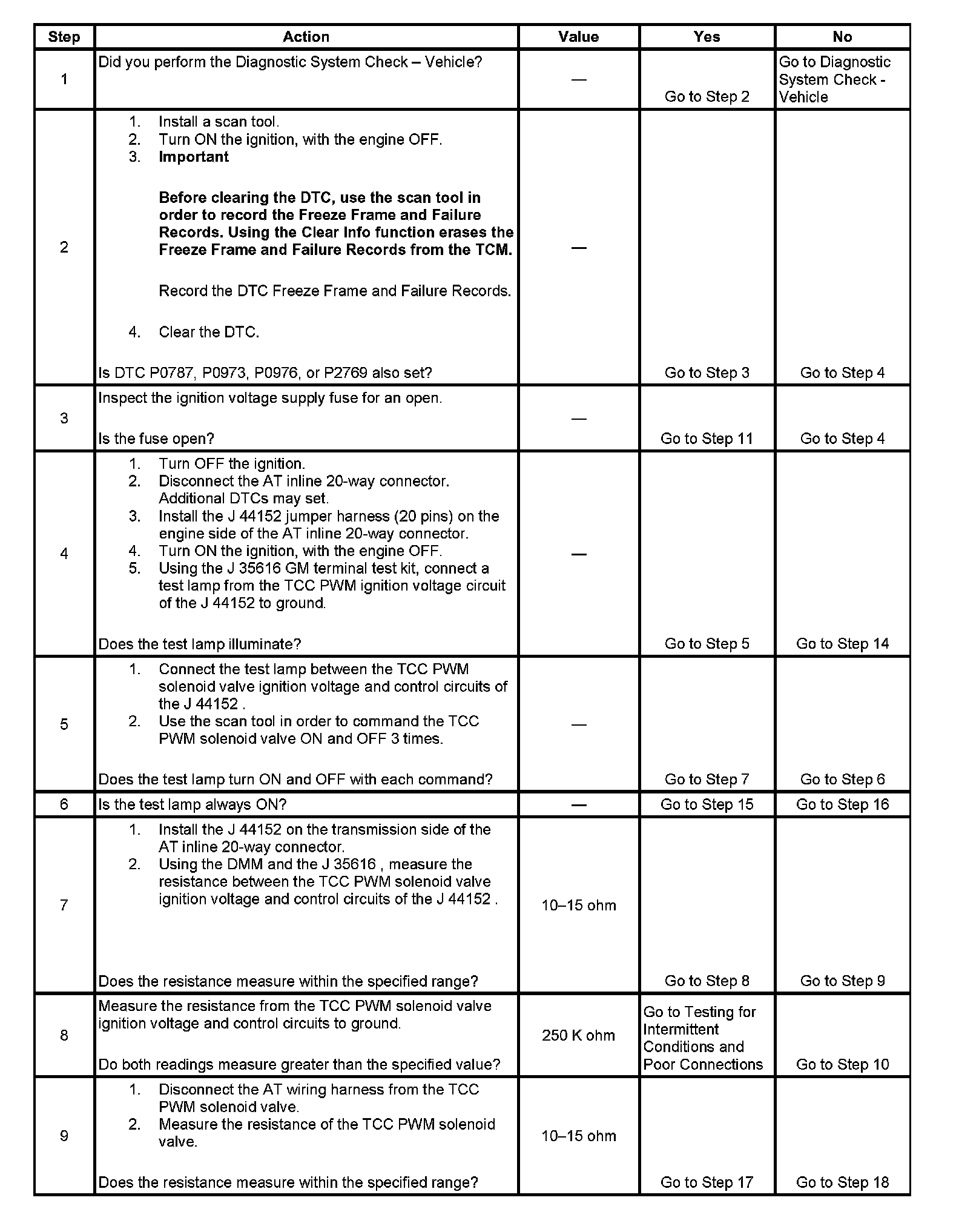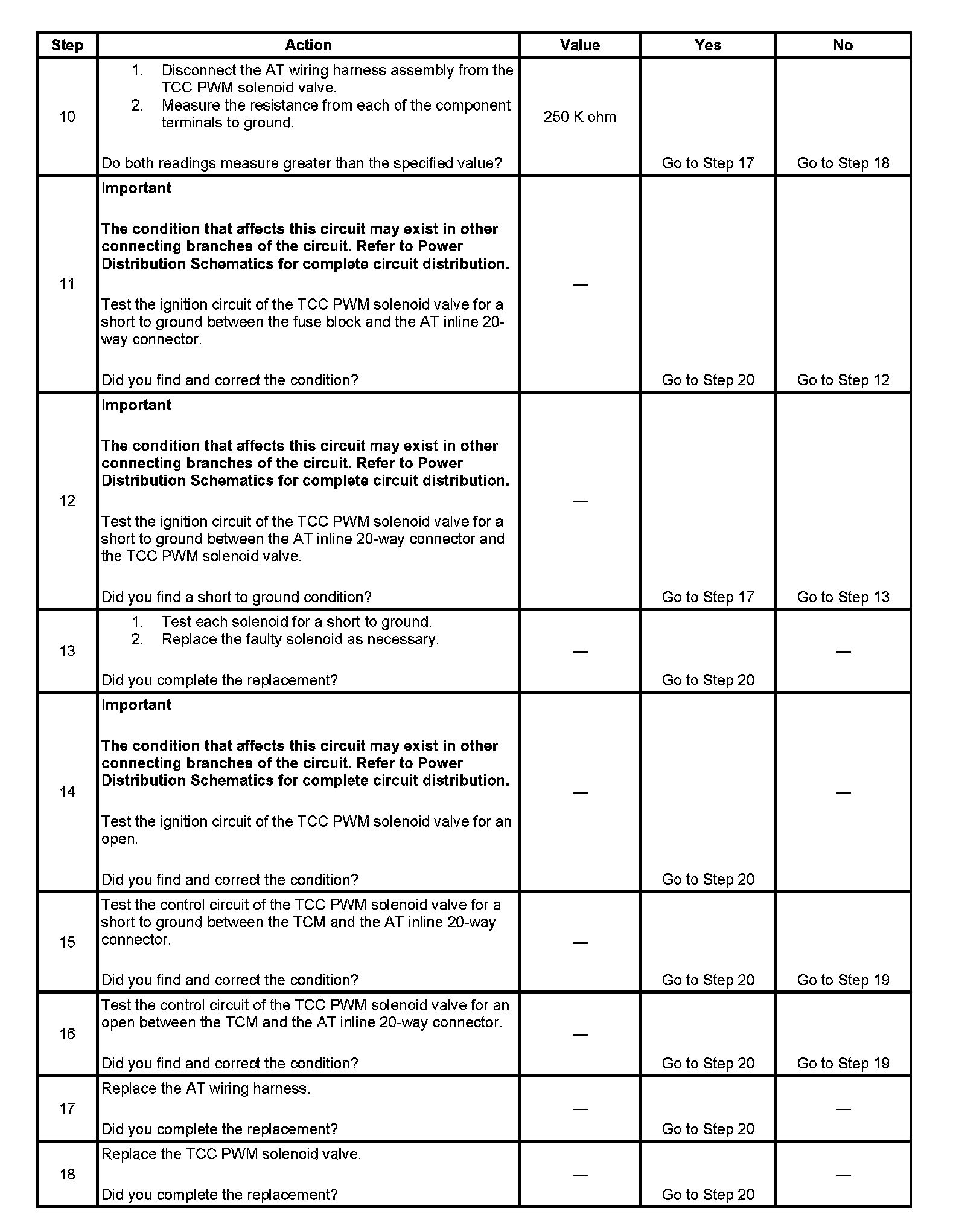 7. This step tests the resistance of the TCC PWM solenoid valve and the automatic transmission (AT) wiring harness.