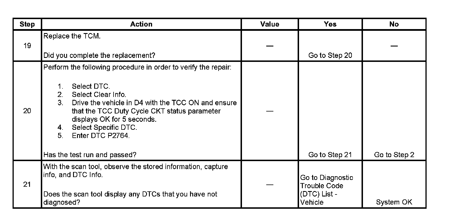 When the TCM detects a continuous open or short to ground in the TCC PWM solenoid valve control circuit, then DTC P2764 sets. DTC P2764 is a type B DTC.