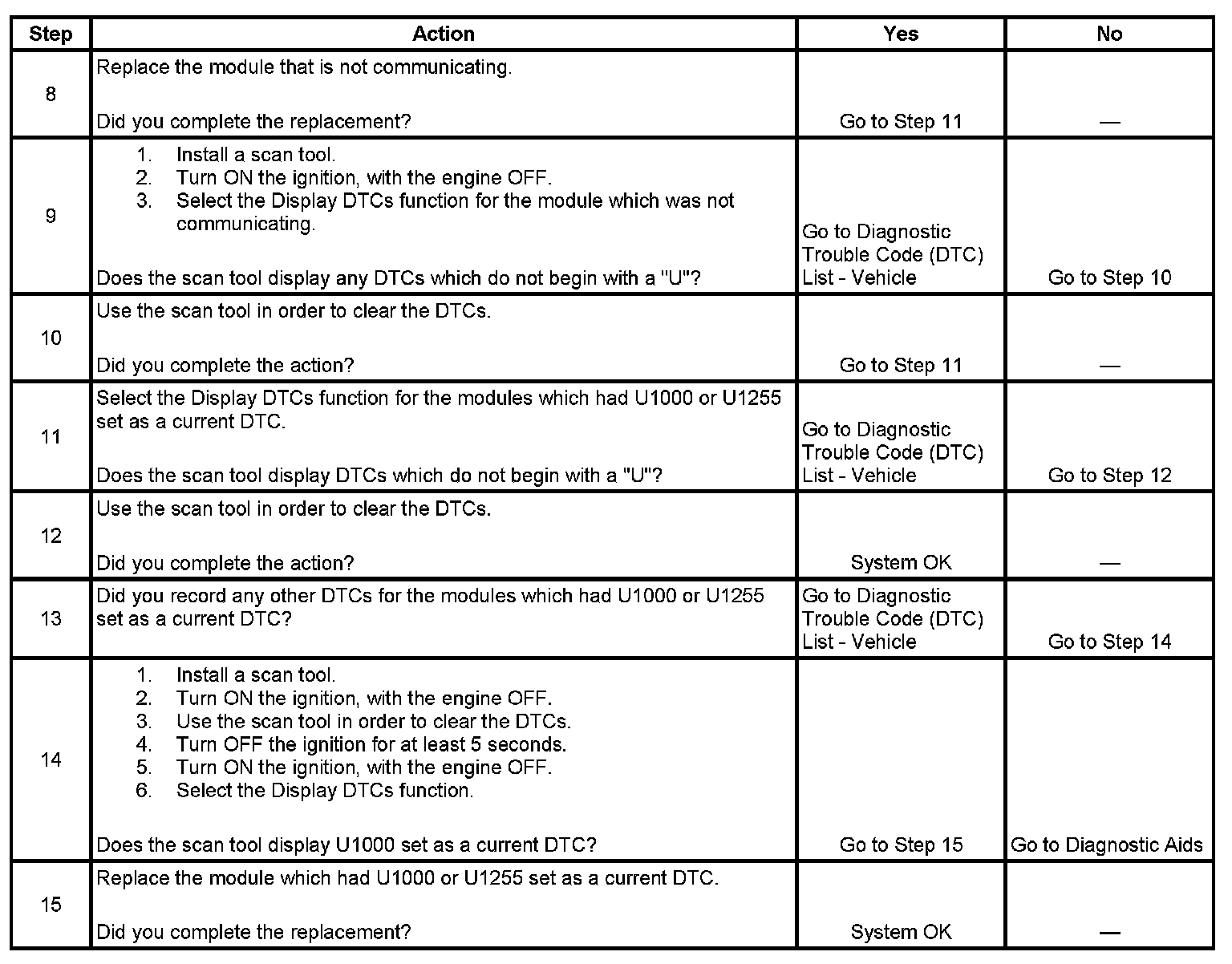 10. The modules which can communicate indicate the module which cannot communicate. You must clear the serial data communication DTCs from these modules to avoid future misdiagnosis.