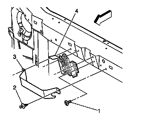 3. Remove the push pin rivet retainers retaining the hood latch cover (3) to the radiator support.