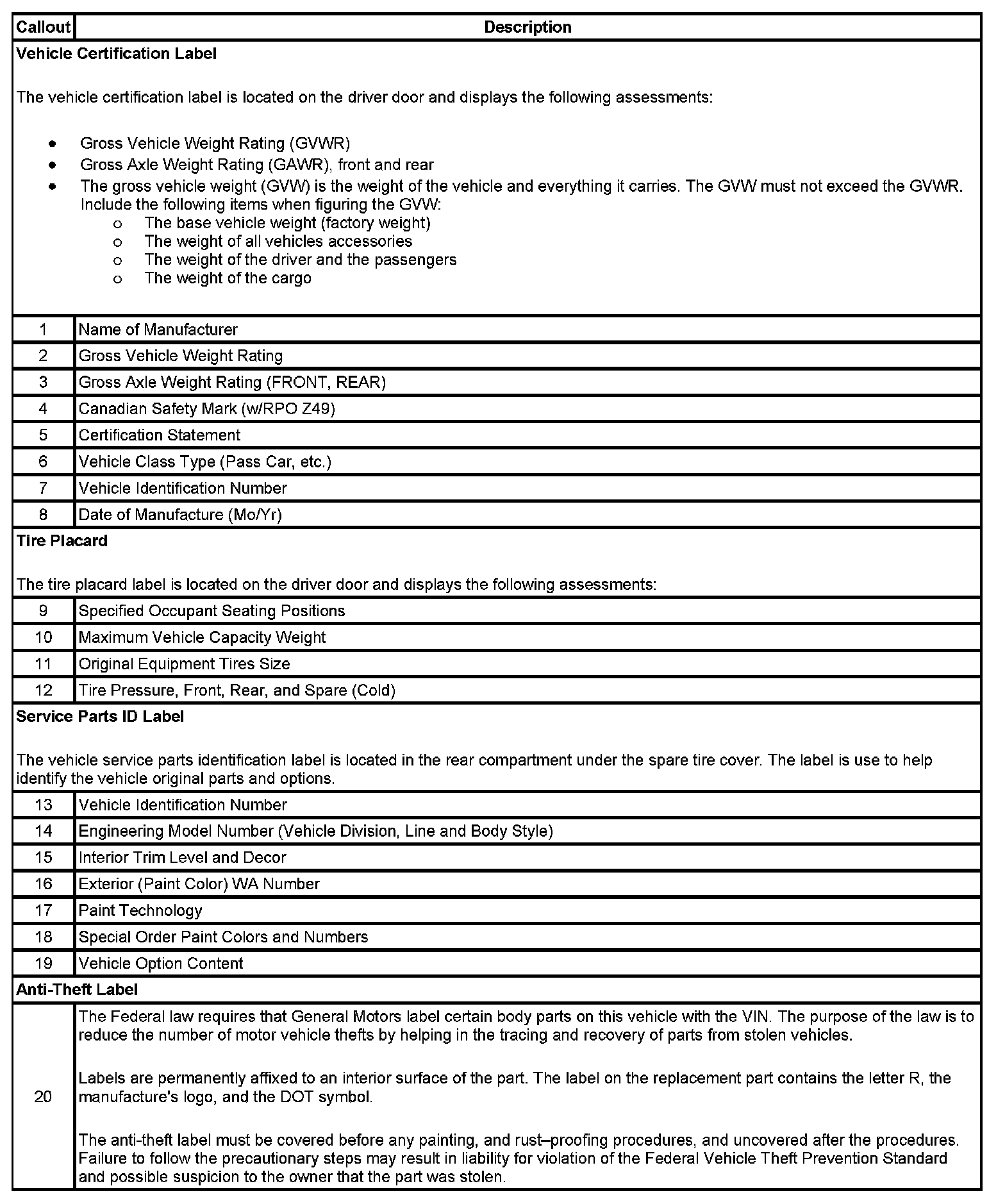 Label - Vehicle Certification, Tire Place Card, Anti-Theft And Service Parts ID: