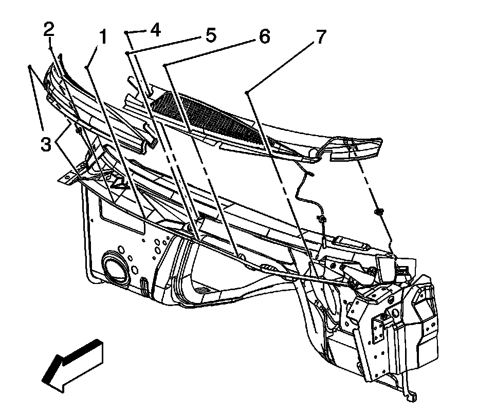 2. Remove the screws 1-7, retaining the air inlet grille panels to the cowl vent.