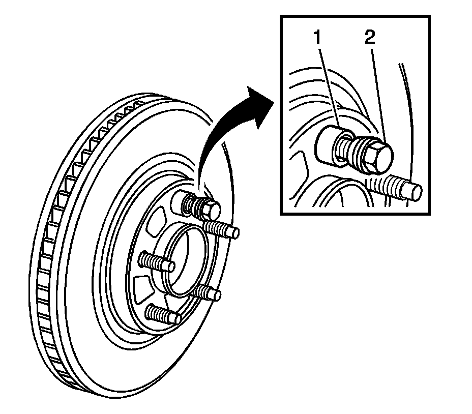 4. Hold the rotor firmly in place against the hub/axle flange and install one of the J 45101-100 (1), and one lug nut (2) onto the upper-most wheel stud.