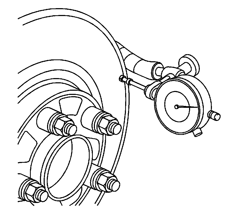18. If the brake rotor assembled LRO measurement is within specification, install the brake caliper and depress the brake pedal several times to secure the rotor in place before removing the J 45101-100 and the lug nuts.
