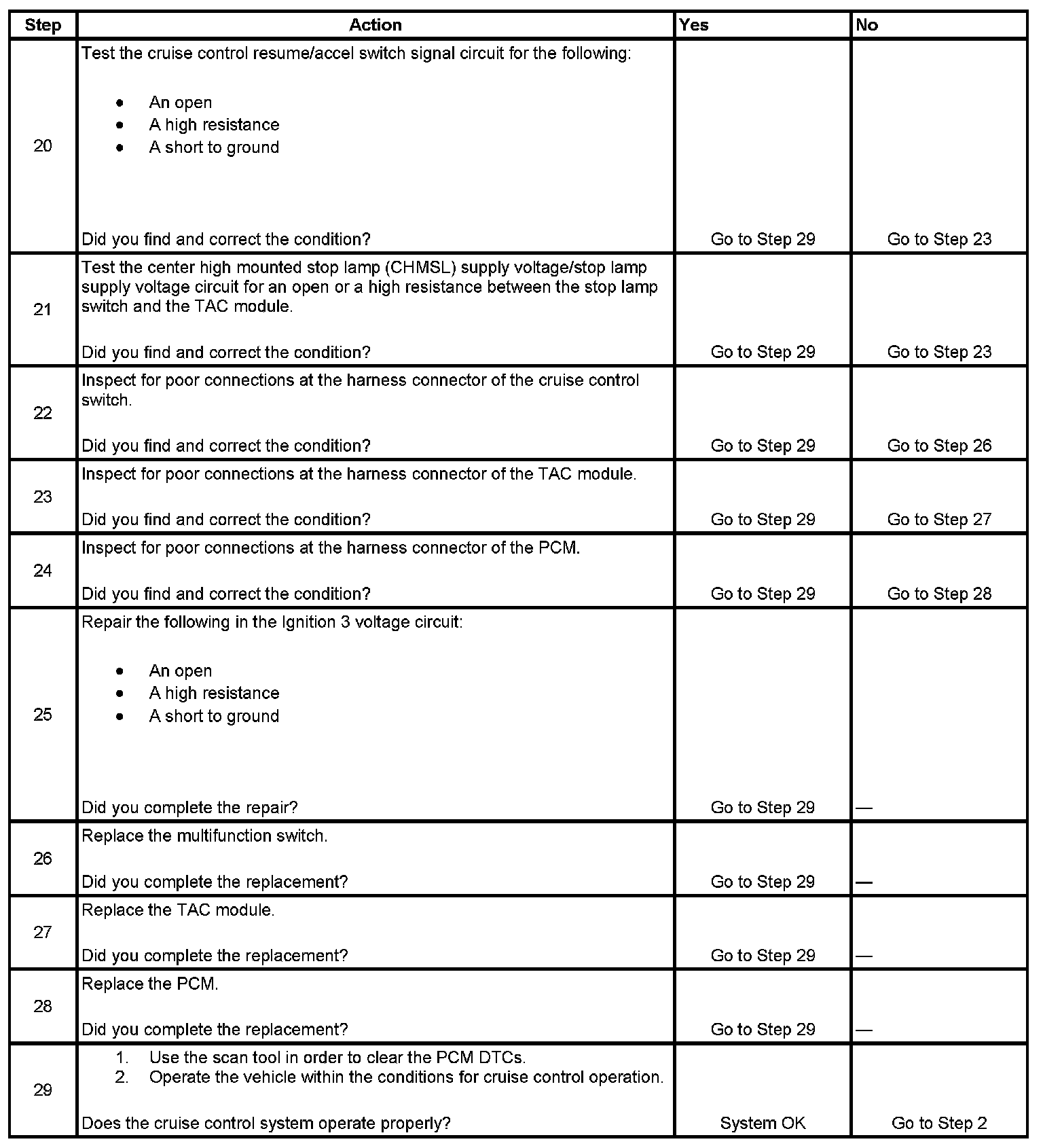 10. This step tests the cruise control resume/accel switch signal circuit for an open or for a high resistance.